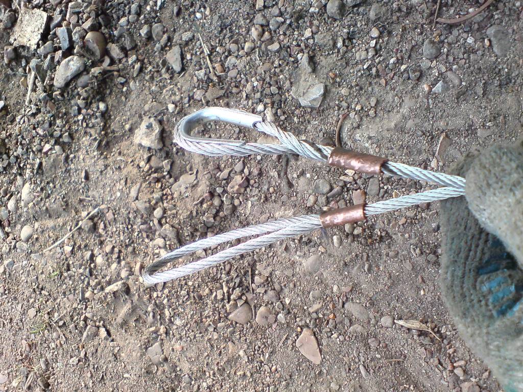 Сначала надеваем на трос кусок медной или алюминиевой трубки, и распускаем конец пополам. Получается две одинаковые стальные пряди, и одна нитка - ее обрезаем.