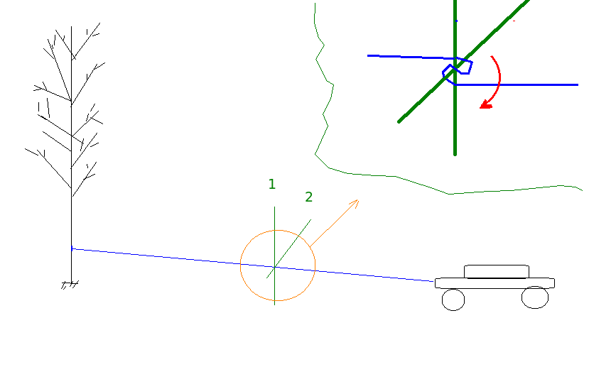 Итак, метОда. Трос цепляем к машине и на всю длину - к дереву, до куда достанет. Берем две палки потолще (для Нивы достаточно толщиной 4см), первую из них затачиваем (нож-то с собой есть?) и вбиваем неглубоко рядом с тросом, примерно посередине. Второй же зацепляем петлю троса, и начинаем наматывать на первую палку. Схематично я попробовал нарисовать это на картинке: