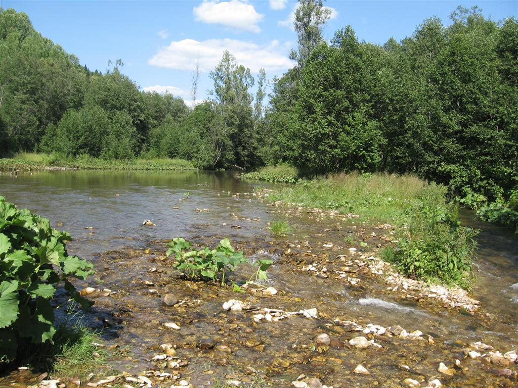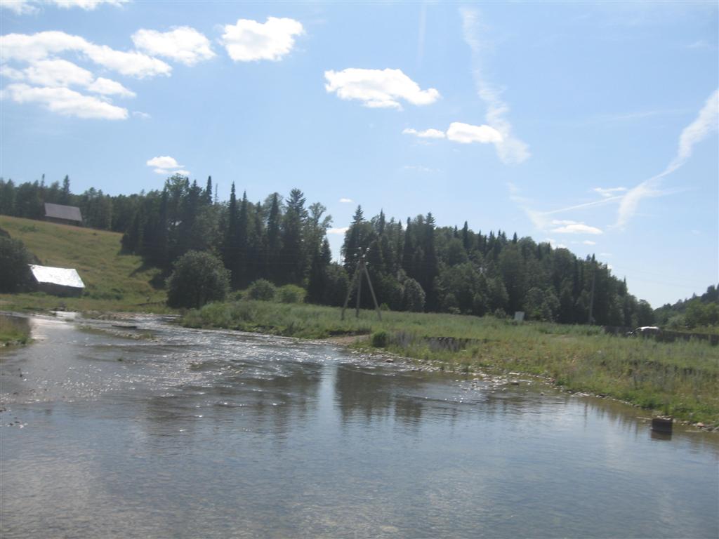 Речка мелкая, примерно по колено, если ее в брод переходить, но широкая, а вода в ней холоднющая. Бррр.