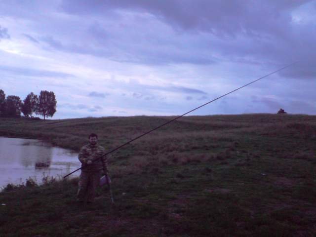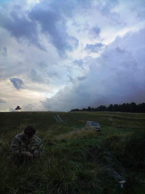 Вечер по началу был тихий, выбрал удобное место у водоема, сидим отдыхает.