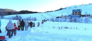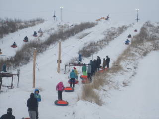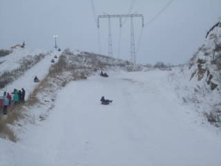 Горок четыре: так называемая "детская" - там где тебя неожиданно сбрасывает с подъемника и прям на горку, и прыжком вниз, летишь уже с горы; и три трассы - две прямые одна под мостом - скорость большая, и ты под мостом пролетаешь - слегда не по себе но все равно ветер в "харю" и я лечууу!; третья не работала - подъемник сломался. И четвертая - где мы и все время катались - она заковыристая трасса, ты летишь на тюбинге волной: туда-сюда подпрыгивая, круто! Народа не так много, как на Лукоморье.