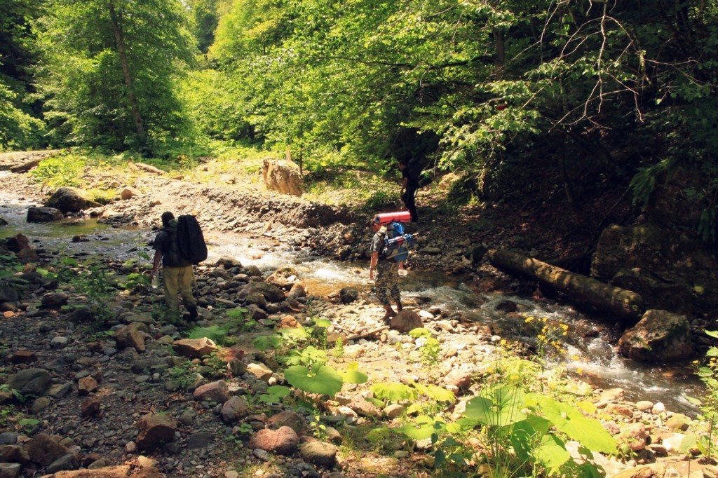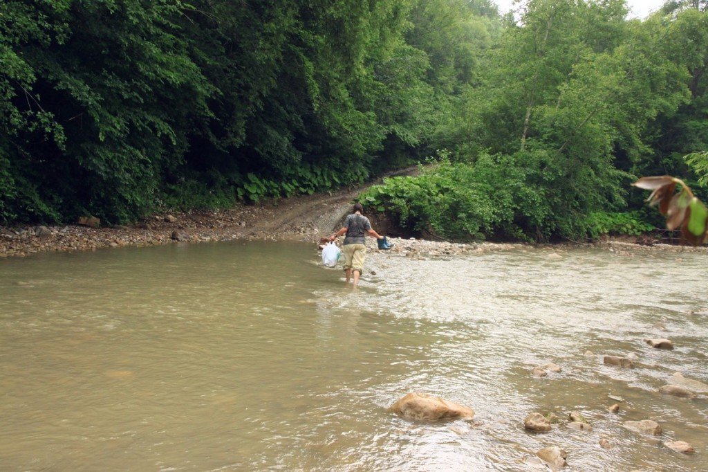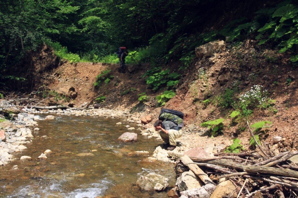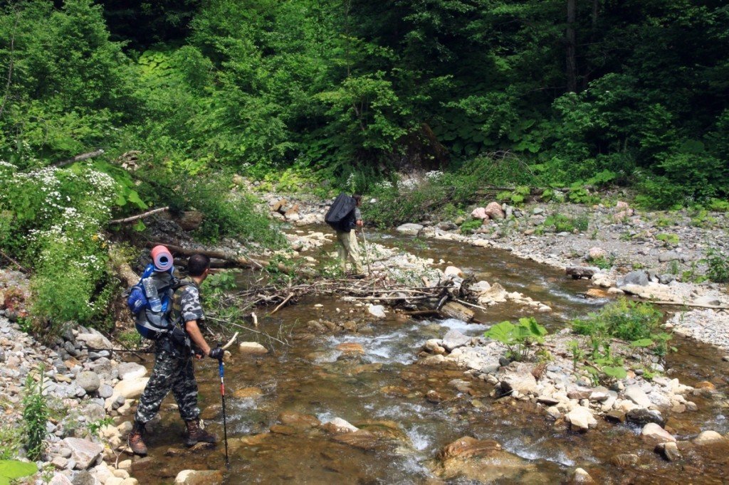 Тут уже сухими ногами не обошлось. Серега эту проблему решил быстро подскользнувшись на первом броде, и уже шел по воде не парясь (благо теплая). Кто-то ещё старался не мокнуть.