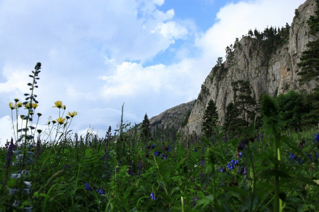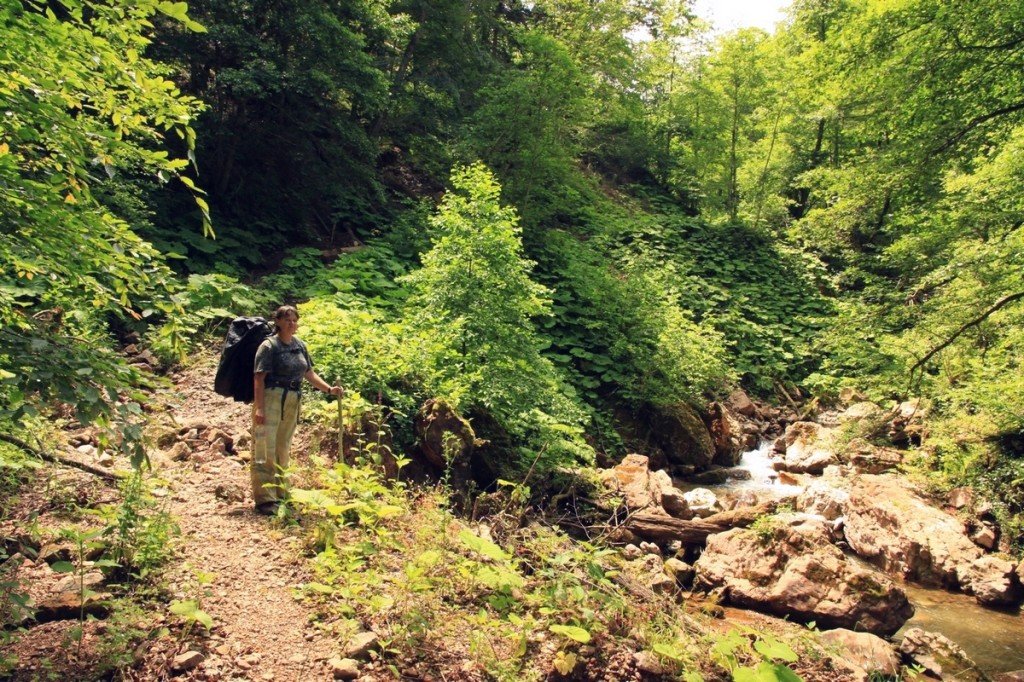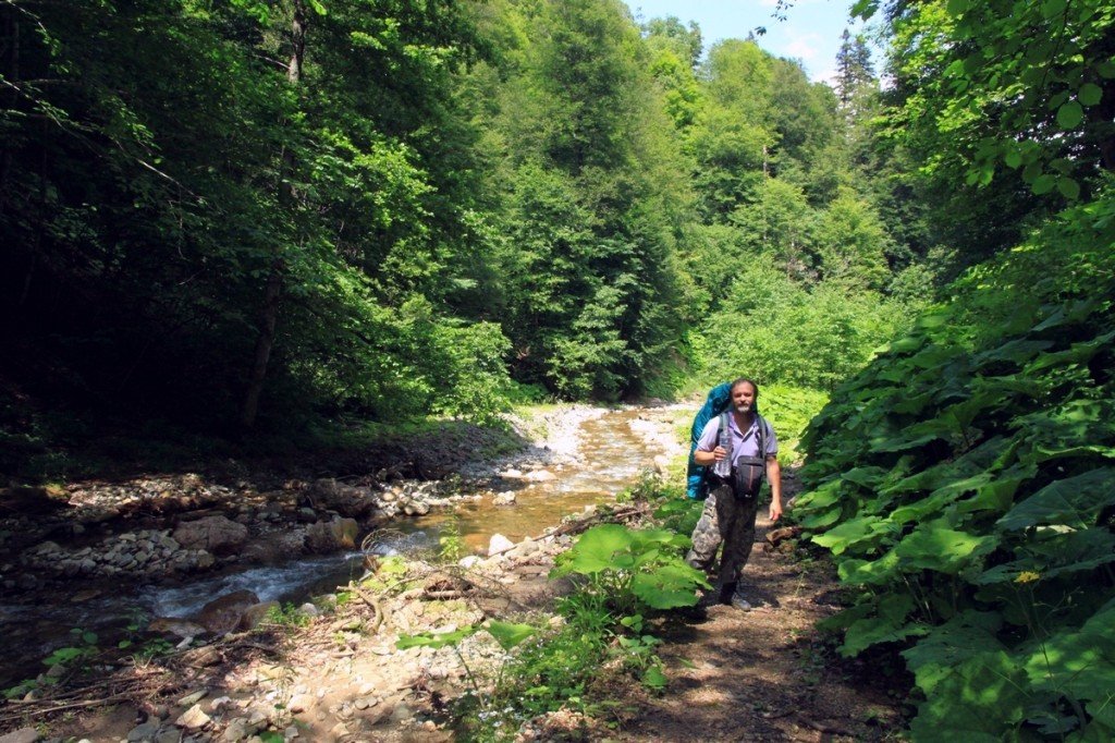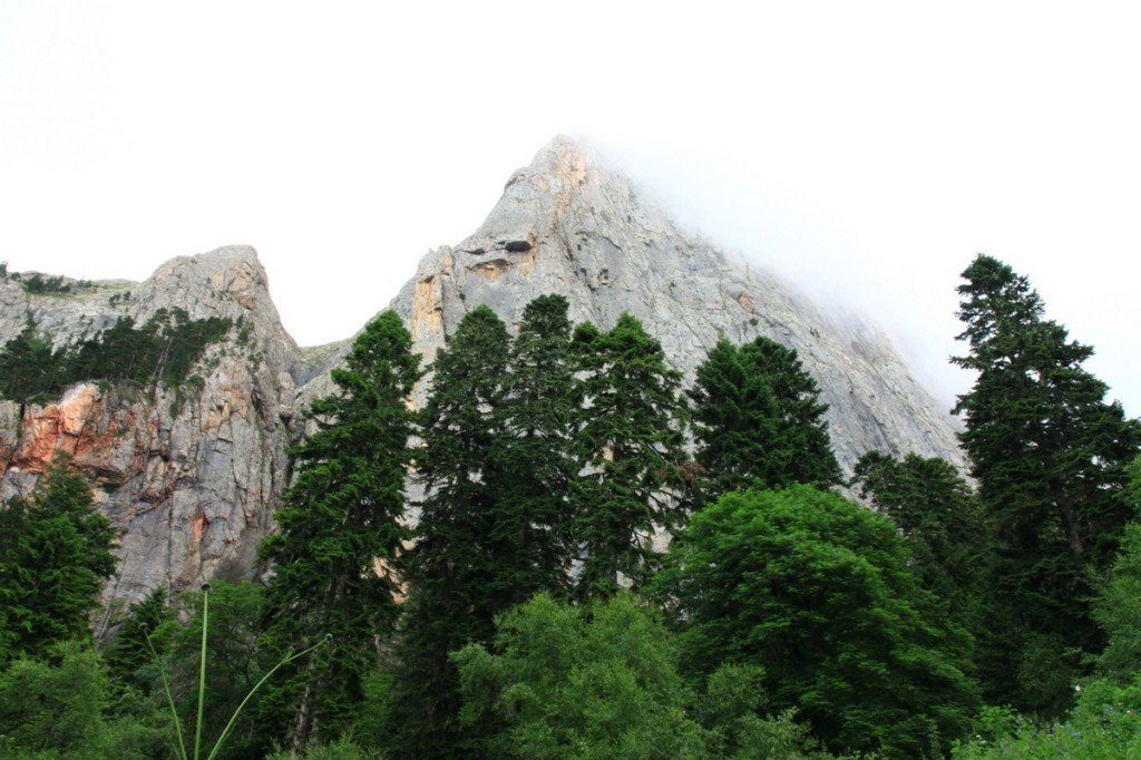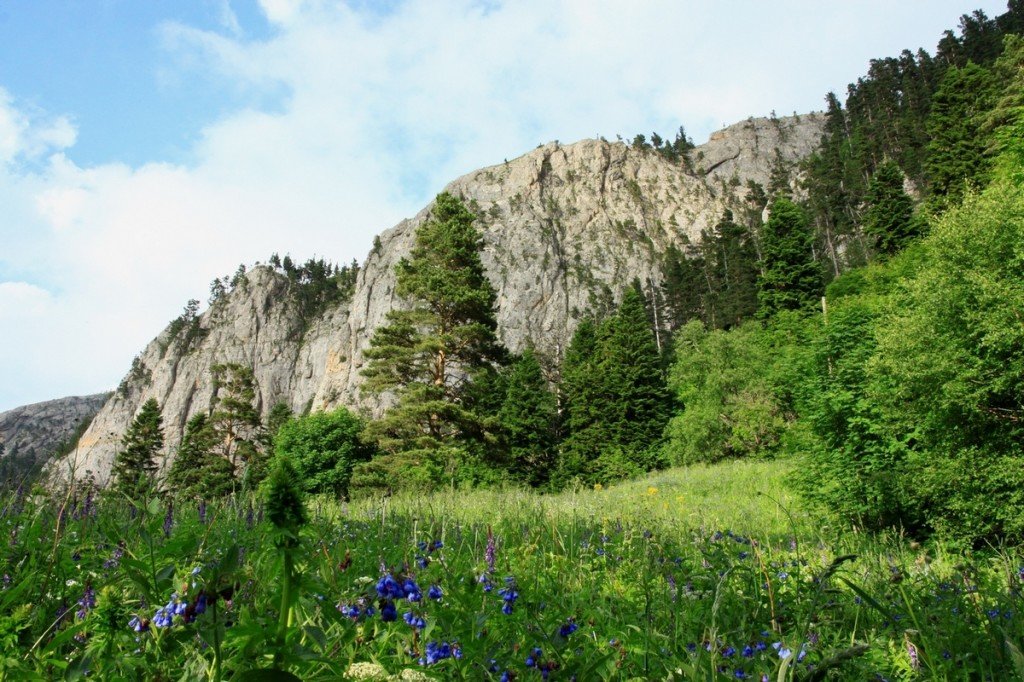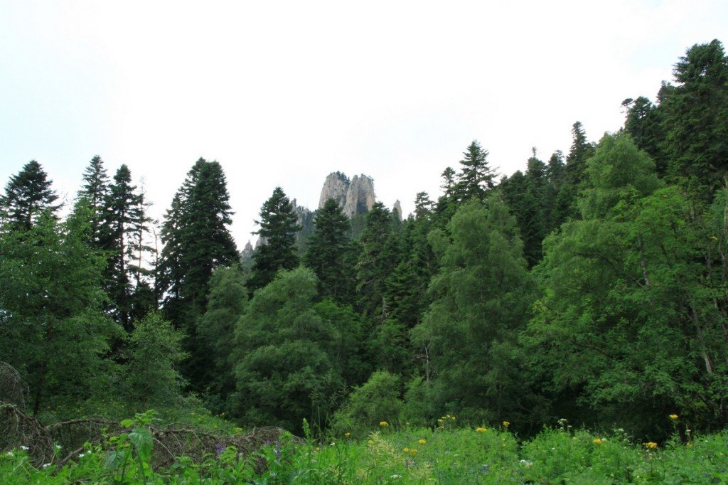 Дошли до развилки рек – дальше в гору по лесу. Тропа маркированная, плутать негде. Вот подъемчик только 1000 на 5000. Хорошо тень в лесу, да и вообще не жарко. Парни вперед убежали, немцы отставать начали, гиды-проводницы русские с одной немкой тоже вперед чешут. Карабкаемся, отдыхаем, снова пыхтим… Остановились, чаек вскипятили. Выяснилось, что чай с собой только зеленый, да и не чай, а помои какие-то… До фото уже руки не доходят, да и лес да лес кругом… Следы медвежьи… Короче поднялись до стены Тхача. Немцев уже не видать не слыхать. Радость 1 – подъем закончился, радость 2 – начались луга… Наивные!!! Горизонталь - сплошные спуски-подъёмы и тоже с набором. Луга – красотишша, трав и цветов море и всё это с человеческий рост +/- и мокрое…