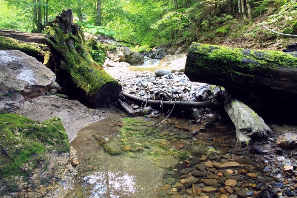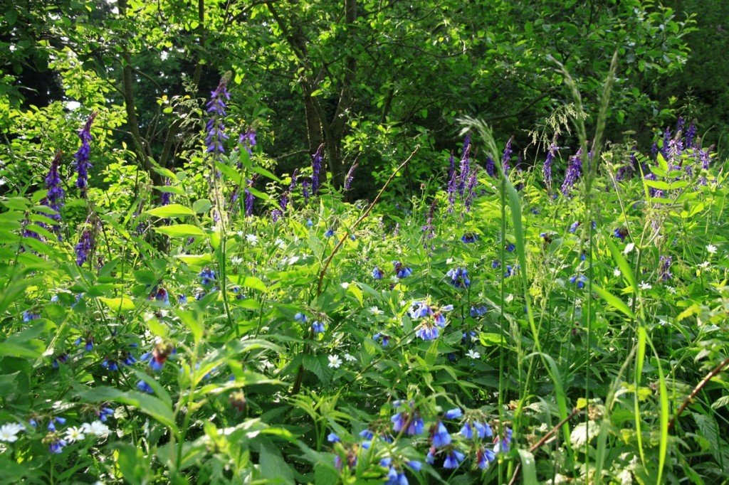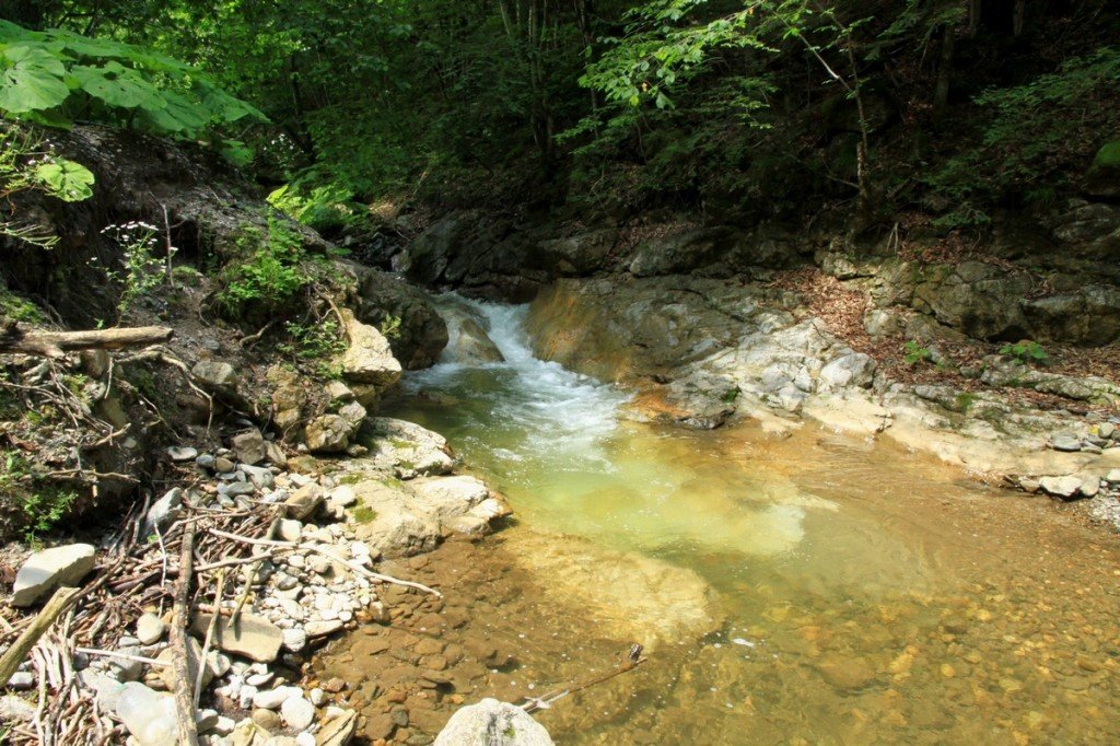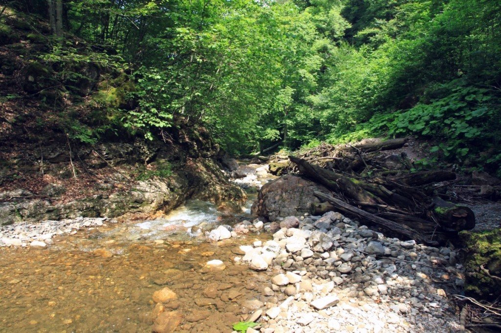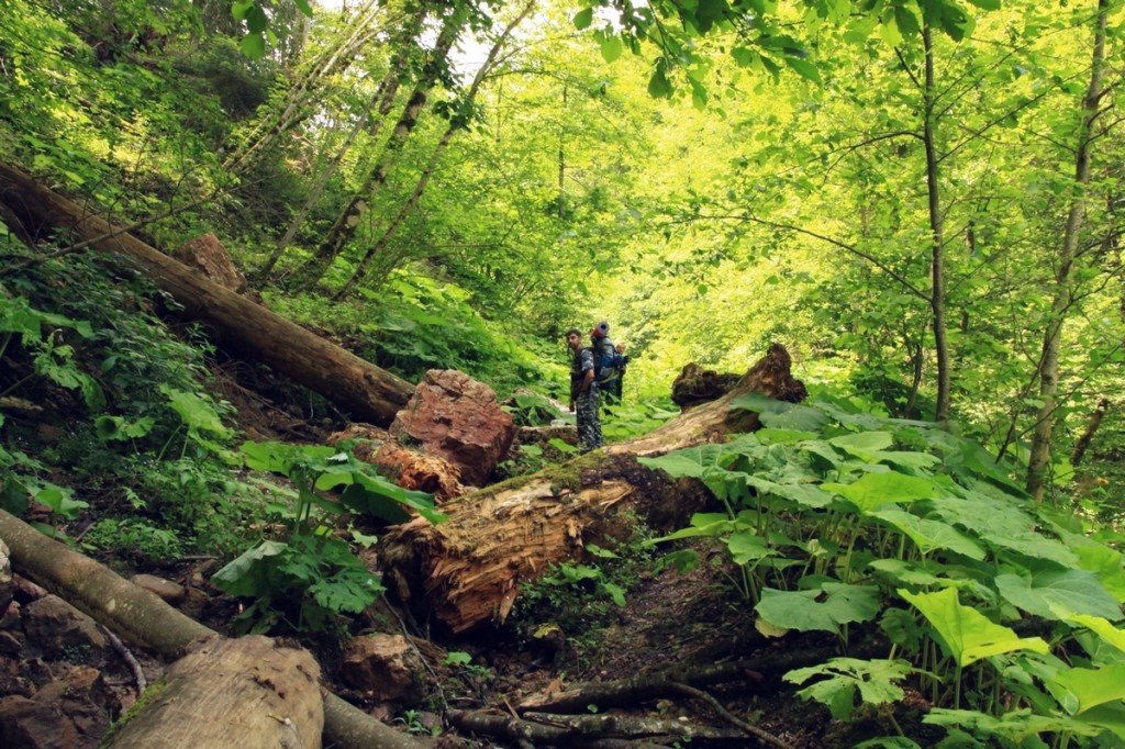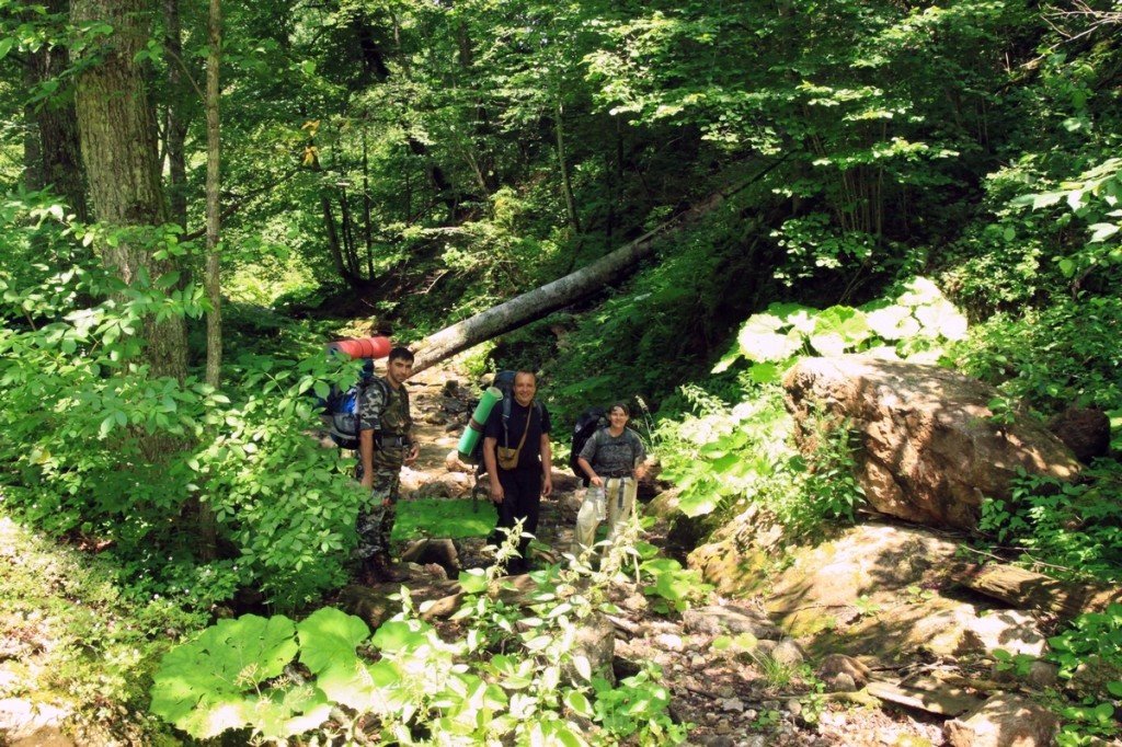 Дошли до развилки рек – дальше в гору по лесу. Тропа маркированная, плутать негде. Вот подъемчик только 1000 на 5000. Хорошо тень в лесу, да и вообще не жарко. Парни вперед убежали, немцы отставать начали, гиды-проводницы русские с одной немкой тоже вперед чешут. Карабкаемся, отдыхаем, снова пыхтим… Остановились, чаек вскипятили. Выяснилось, что чай с собой только зеленый, да и не чай, а помои какие-то… До фото уже руки не доходят, да и лес да лес кругом… Следы медвежьи… Короче поднялись до стены Тхача. Немцев уже не видать не слыхать. Радость 1 – подъем закончился, радость 2 – начались луга… Наивные!!! Горизонталь - сплошные спуски-подъёмы и тоже с набором. Луга – красотишша, трав и цветов море и всё это с человеческий рост +/- и мокрое…