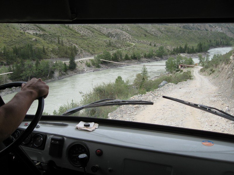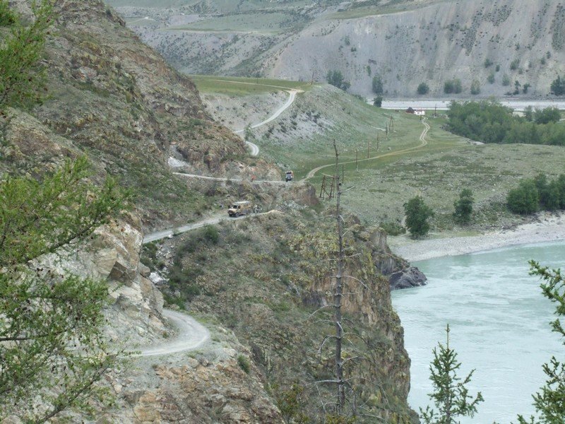 Едем дальше. Есть такая дорога на картах Иня-Тюнгур. Только на картах. Строили, когда-то кто-то по ней даже ездил, даже километраж на Тюнгурском тракте от Чуйского считается. Много историй и версий, мало фактов. Участок проезжий всё ж есть до ближайшего поселка. Интересно же. Мост висячий через реку, дальше дорога в стене рубленая и виды на слияние Катуни-Чуи. Ребята предпочли местами пешком прогуляться. С плато хорошо всё смотрится.
