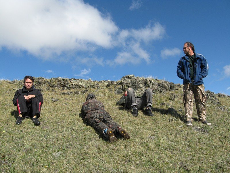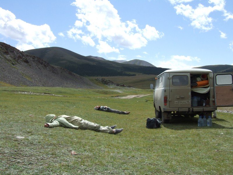 Перед перевалом остатки давно заброшенного погранпоста. Поднялись на Бугузун. Вот она впереди Тыва! Такая же степь, такие же горы. Только сверху видно как по всему горизонту северному небо чернеет. Перекур. Мы с Таней (штурманом) в карты играем, народ пошел окрестности изучать. В первом же ручейке тапочки промочили, вернулись, сидят поодаль разговоры разговаривают, с тоской на небо смотрят. Чую не к добру. Подходим, с намерением дальнейшие планы обсудить, а по глазам уже всё видно…