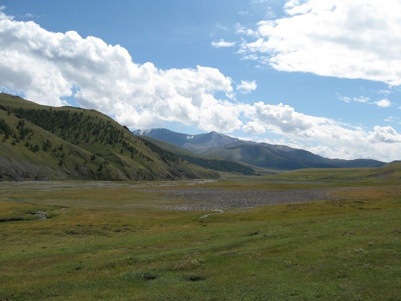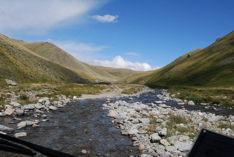 Кош-Агач. Город посреди этой каменой пустыни. Деревья можно пересчитать по пальцам. Плоские земляные крыши. Последний поселок, дальше погранзона. Оформляем пропуска в погранотряде – быстрее чем в Акташе получается. Заправляем все баки и канистры под пробку, закупаем продуктов на неделю. Выезд, пост погранцов, проверка документов на этот раз даже без фэйсконтроля. Дальше прямо Монголия, налево Тыва. Уходим налево. Селение Кокоря - асфальт кончается. Ездить по степям межгорным своя специфика. Вроде и дорог море и направления правильные, но выедешь ли ты к нужному броду, седловине или перевалу, или тупиково к зимовью… Карты, компас, чутьё в помощь. Навигатор – вещь не совсем бесполезная, но и довольно вредная и для очень ограниченного и умелого применения (сугубо личное мнение). Едем на перевал Бугузун – граница Тывы. Конец лета самое сухое время. Броды проходятся легко, на месте некоторых рек и ручьев сухие русла. Полсотни километров ни единой живой души. Степь да степь кругом… По всем сторонам горизонта горы… И мнооого-мнооого неба. У очередной речки остановились, перекусили, кто-то водные процедуры устроил – благо вода не ледниковая.