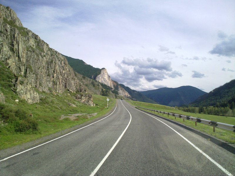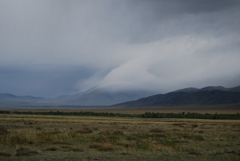 Едем молча. А над горами "ужас" собирается, да быстро так. Проанализировав с Таней возможные +/- отошли немного, да и Алтай большой – найдем где оторваться. Переключились на фотографию. С одной стороны небо голубое с облачками, с другой уже ни неба ни гор – сплошной УЖАС!