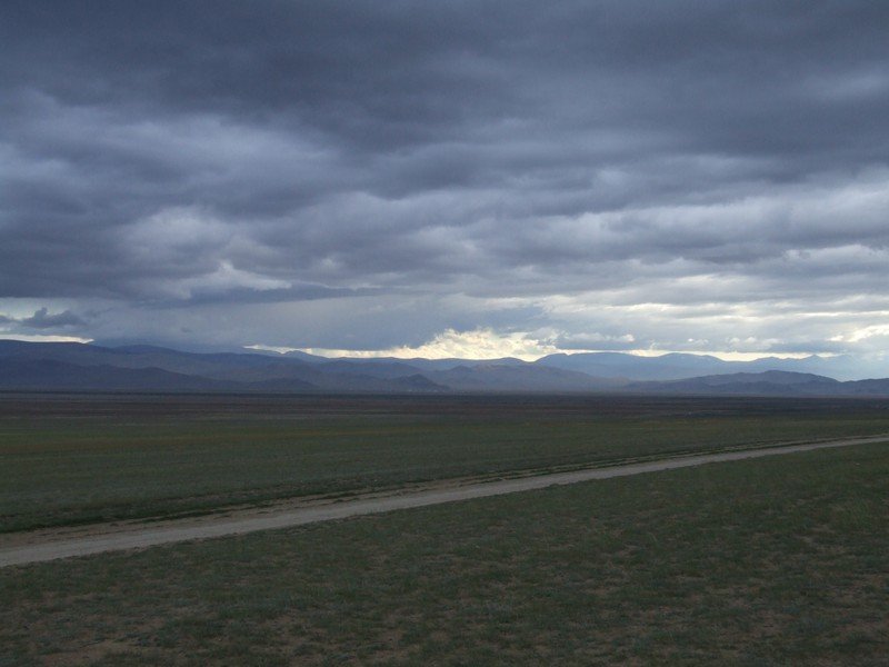 Горизонта нет! Вместо гор черно-синяя стена. Представляю, что там сейчас творится и немного сожалею, что не там (да, больной!), зато ещё один успокаивающий аргумент, что не потащил туда группу… Выехали на тракт. Говорят в Чуйской степи дожди редкость – нам повезло. Поливает, что дворники не справляются, ветром машину рвет с дороги. Пятнадцать минут и тишина… То ли приснилось, то ли глюк? Солнышко, пар от асфальта, только вершины хребта все белые – нет, не глюк.