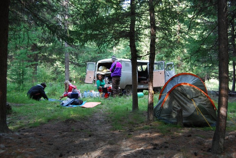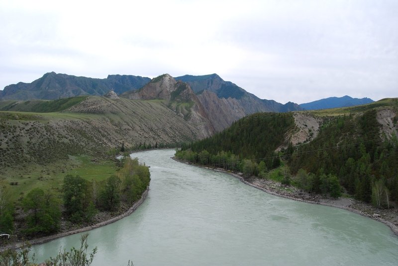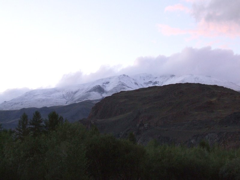 И снова тракт. Поиски очередного уютного пристанища практически на полуострове в изгибе Чуи. Лес кругом и кусты, укрывающие от неслабых ветров, что совсем не лишнее – дома "людям бывалым" трудно объяснить, что понимается под теплой одеждой в разгар лета в горах с ледниками. Поэтому форма одежды "всё на себя". Мысли тревожные: "А если ливень в горах?" поляна-то практически вровень с урезом воды. Но мы ж везучие и колдун с нами! Костерок, ужин – хорошо!!!