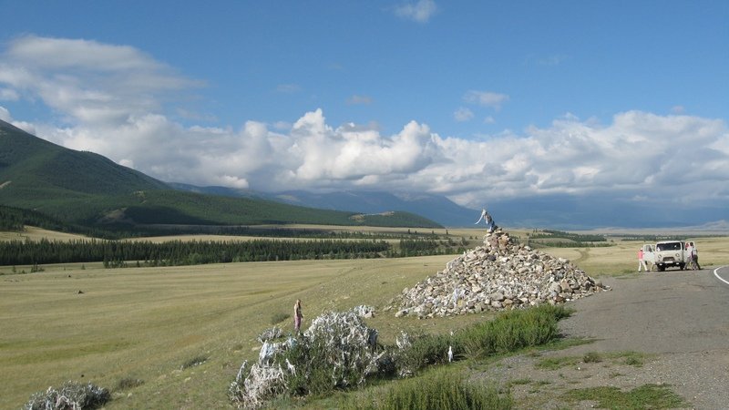 День следующий. Курайская степь. Это опять же видеть надо! (к ней еще вернемся) Курган из камней. Проезжающие кладут камни, не знаю всех подробностей, то-ли чтоб впустила, то-ли выпустила. Хоть и не исповедую, но кладу, и народ агитирую (а кто его знает…). Горы отступают. Чуйская степь. Почему степь? - Пустыня каменная. Годовой перепад температур порядка 100 градусов, количество осадков стремиться к 0. А люди живут! И землю покупают за деньги немалые, и строятся… Загадка!