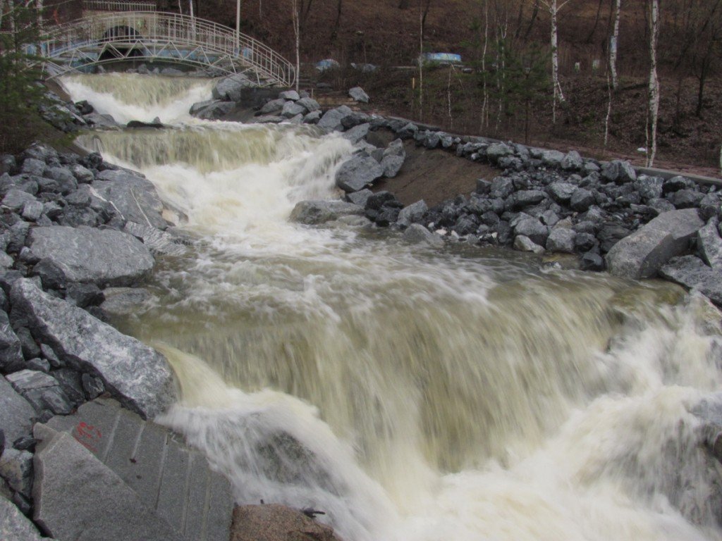"На левом берегу р. Ай, река Каменка вырывается из горного склона звонким потоком." В поселке Межевой (Саткинский район)