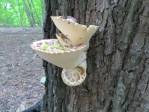 Трутовик пестрый заметен в лесу издалека, на упавших деревьях белеют огромные блюдца. Крупные плодовые тела этого трутовика часто имеют седловидную форму. На желтоватой шляпке крупные бурые чешуйки. Толстая, короткая ножка боковая или экцентрично расположенная к шляпке, у основания темно-бурая, плотная и твердая, даже у молодых грибов.