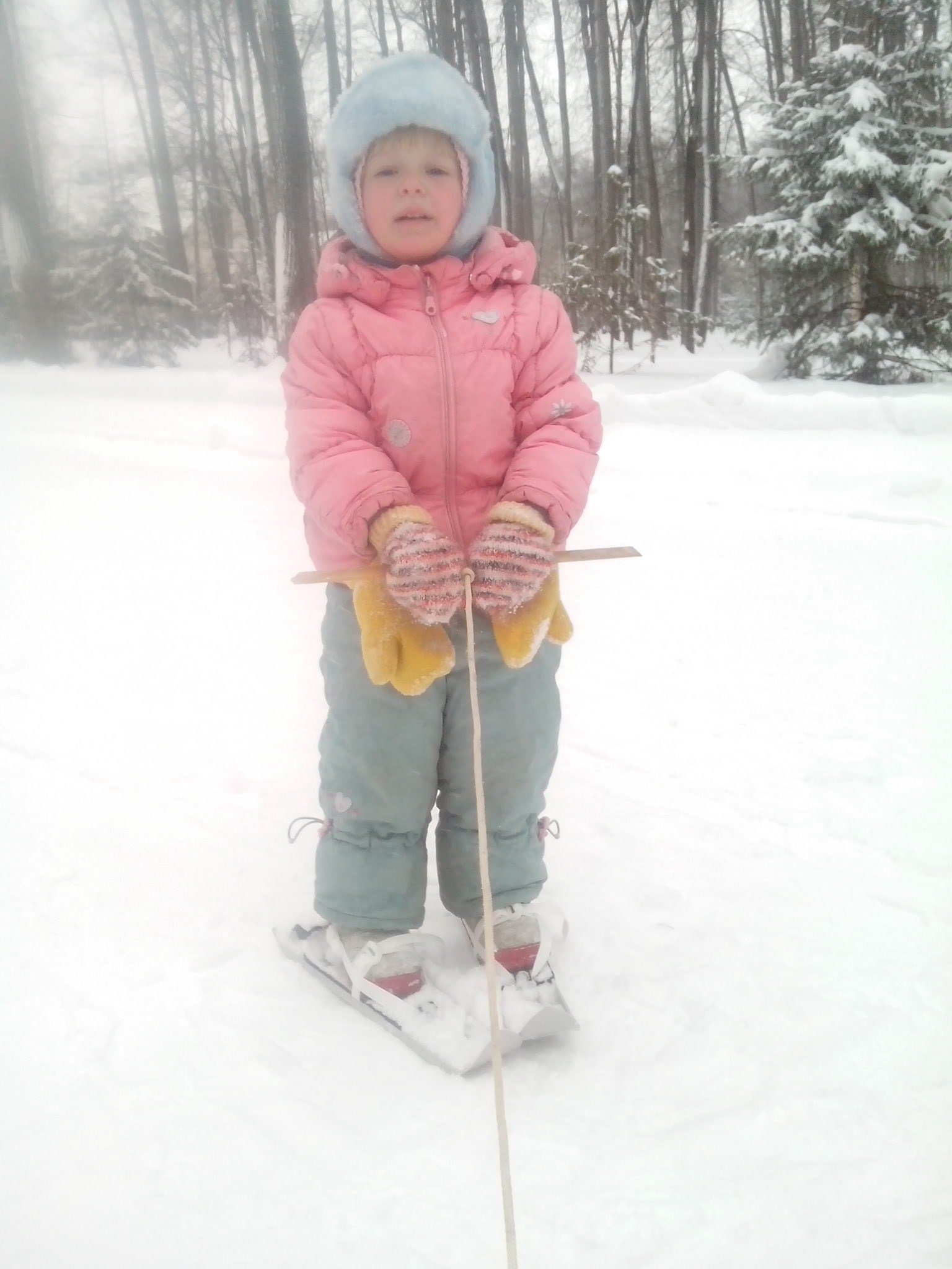 На следующий день мы начали изучать повороты: переступая "веером", рисовали лыжами солнышко, учились переставлять лыжи, разворачиваясь назад. Первые шаги на лыжиках я дочу подбадривала, хвалила, ну а когда падала она, то вместе смеялись и кидались друг в друга снегом.Так в день по минут тридцать тренировались. Чтобы малышка не только научилась ходить на лыжах, но и скользить, соорудили для этого дела буксир - круглую палку привязанную к крепкой веревке. Показала малышке как нужно держать ножки "пружинкой" - чуть согнув их в коленях, и немного наклонившись вперед. И потянула медленно за веревку. Лыжи при этом стоят на месте, ребенка выпрямляется и падает носом в снег. Ее раз повторяем - ноги полусогнуты, подталкиваю сзади тихонько. Вот так нужно держаться и катиться. Кивает. Начинаю буксировать. Вот и славненько, медленно покатили. Дочке понравилось так на веревке кататься. Неделю мы выходили по вечерам немного потренироваться. Но в связи с морозами, наши вылазки временно прекратились, но скоро снова начнем кататься, и уже всей семьей выйдем в лес на лыжах.