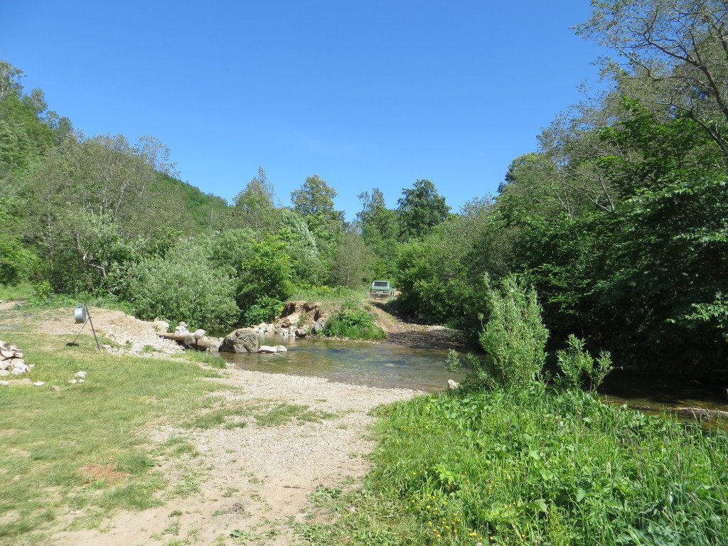 Несколько машин и автобус стояли у брода через речку. Подготовленные столы и скамейки ждали детей, они как раз возвращались с экскурсии.