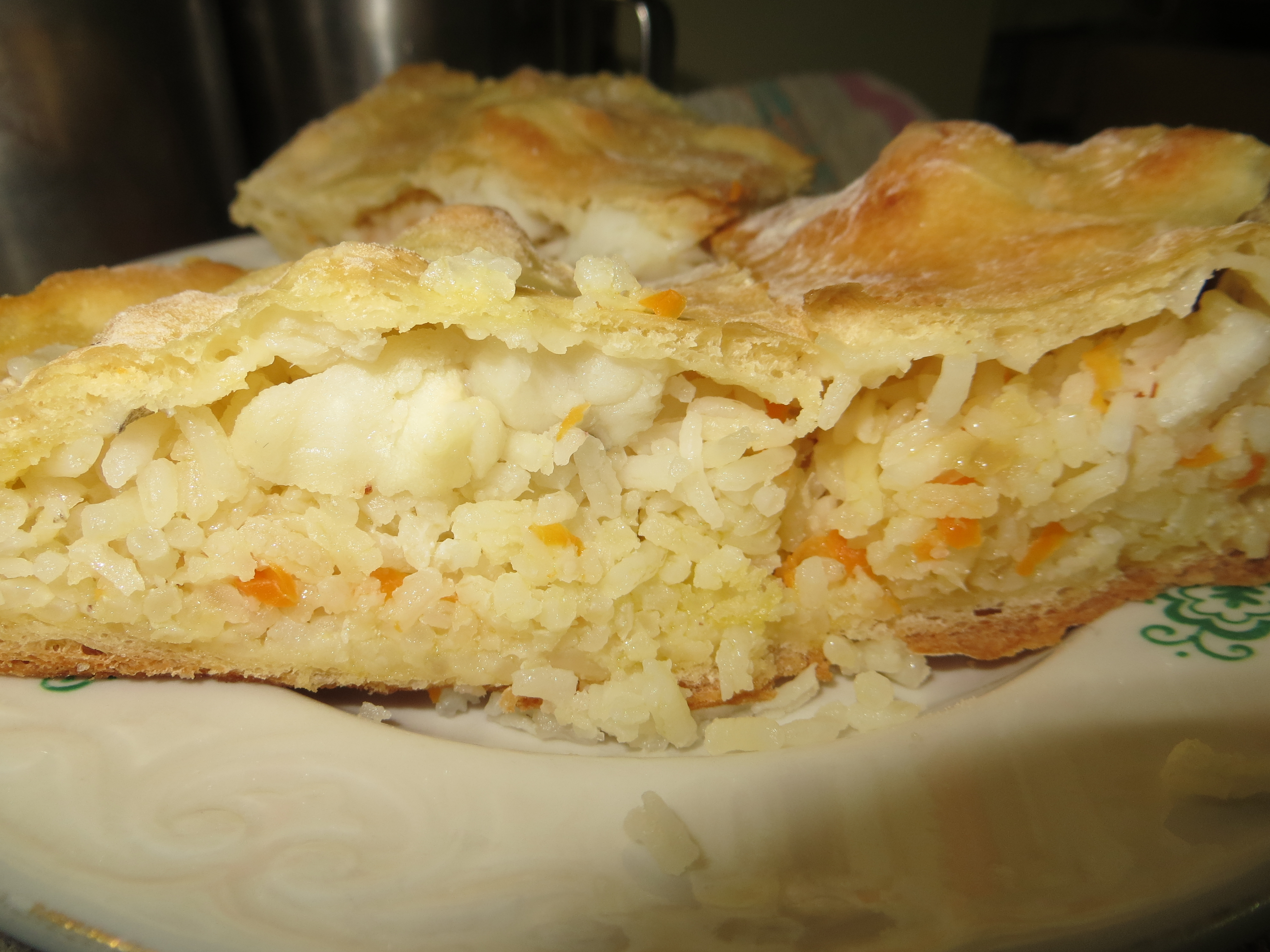 Но дома готовить зубатку надо бережно; жарить — только портить, на сковороде она легко превращается в рыбное желе размером в четверть от исходного куска. В интернете удалось найти совсем немного рецептов из зубатки, в основном это запекание. Пробовали - получается рыбный бульон с мелкими кусочками рыбы. Но раз она при приготовлении вытекает почти вся - не обратить ли это во благо? Пусть вытекает куда-нибудь с пользой, например в гарнир. Попробовали потушить с рисом - лучше, но что-то не то. А потом вспомнили - есть же рыбный пирог с рисом! А может сделать его из зубатки?