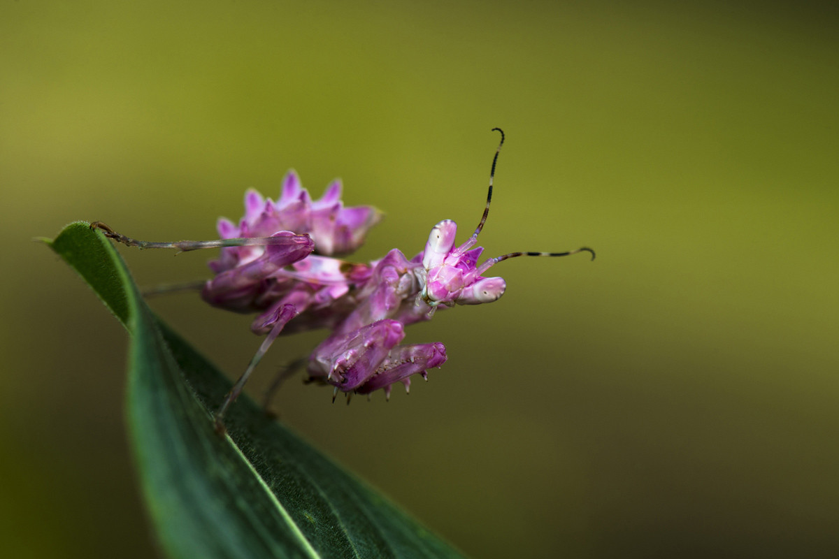 Богомол, сейчас он розовый, с возрастом станет белым. Снимок сделан в Франсвиле, Габон. Автор фото: Нил Рахола