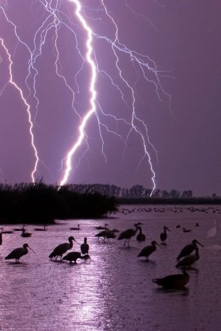 Птицы в озере под фиолетовой вспышкой молнии. (Бенц Мейт)