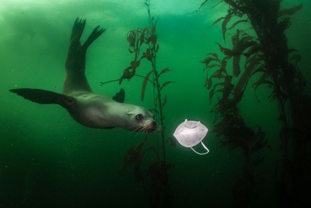 Выброшенная маска для лица привлекает калифорнийского морского льва. (Ральф Пейс)