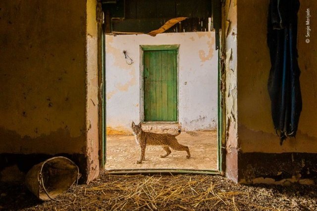 Молодая иберийская рысь останавливается, чтобы осмотреть окрестности, была сфотографирована через дверной проем заброшенного сеновала на ферме в восточной части Сьерра-Морена, Испания. (Sergio Marijuán)