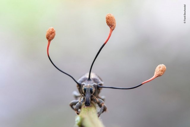 Во время ночной экскурсии в перуанские тропические леса Амазонки Фрэнк заметил этого странного вида долгоносика, цепляющегося за стебель папоротника. Его остекленевшие глаза показали, что он мертв, а три антенкообразных выступа, вырастающие из насекомого, были спелыми плодовыми телами гриба-хищника. (Фрэнк Дешандоль)