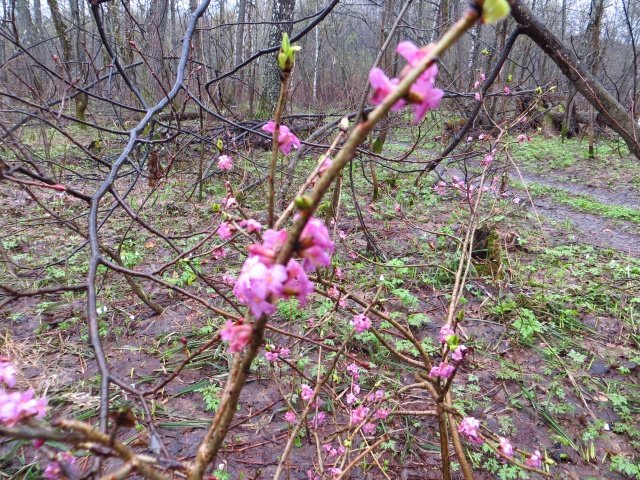 Мы все поднимались и поднимались. Вот только этот перевал пройдем и будет спуск. Вот вроде и вершина, а за ней следующая еще выше. И дойдя до нее, остановились на более менее открытой полянке, чтоб поймать спутники. В мокром лесу спутники не особо хотели ловиться. Пока муж общался с техникой, я отдыхала и ходила по кругу, как вдруг встретила такой вот кустик с розовымии цветоками на веточках, прям сакура лемезинская) среди серости и мокрости такое чудо розовое.