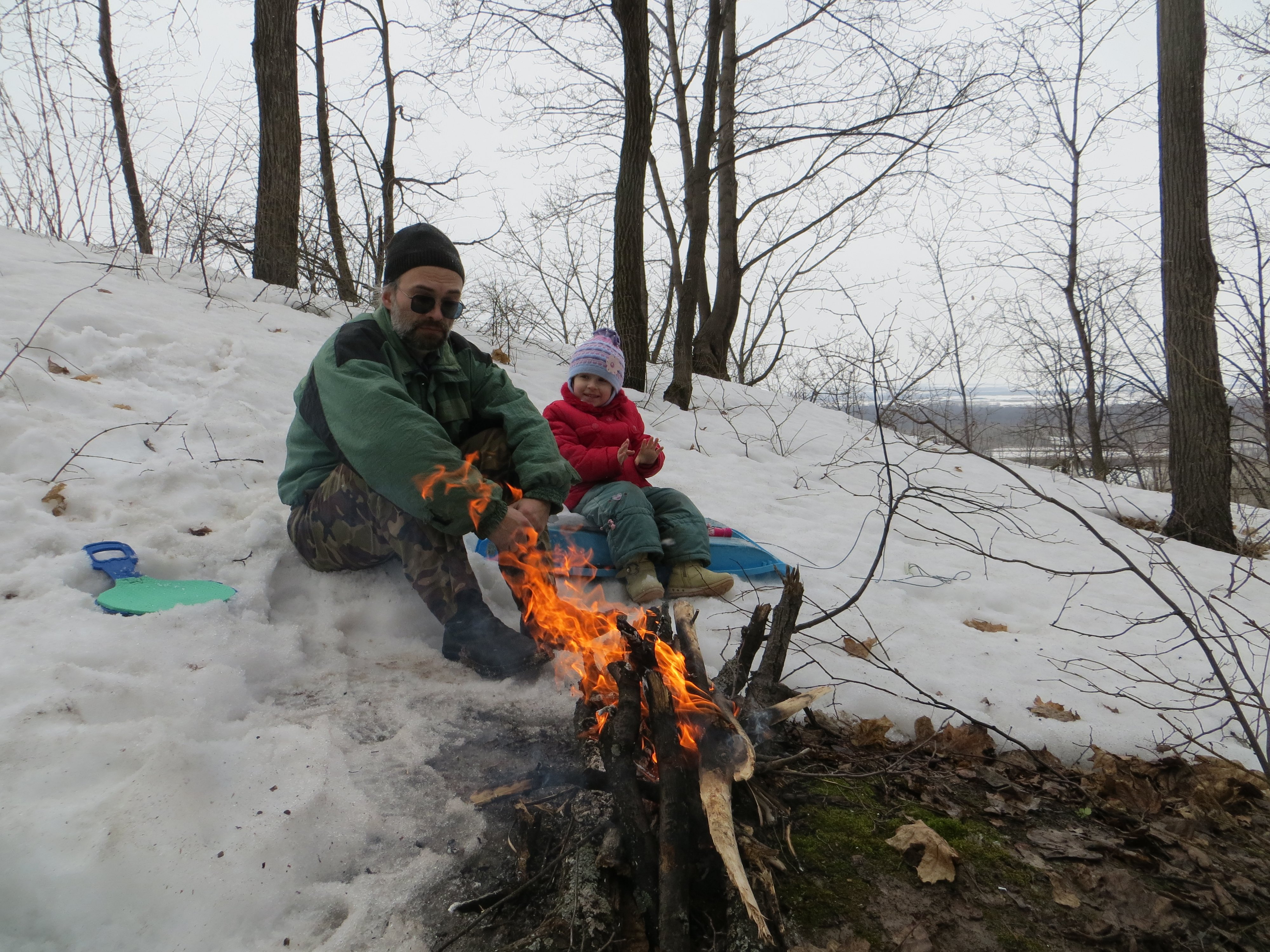 Костер жаркий получился. Обогрел нас, снег вокруг подтопил. А весна показала нам свои владения. Что каждое деревце она уже пробудила, и они своим теплом землю обогревают.