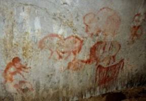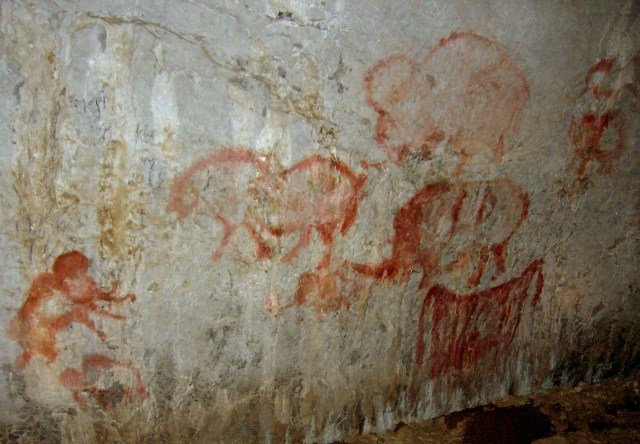 Древние наскальные рисунки были открыты в 1954 году зоологом А.В. Рюминым.