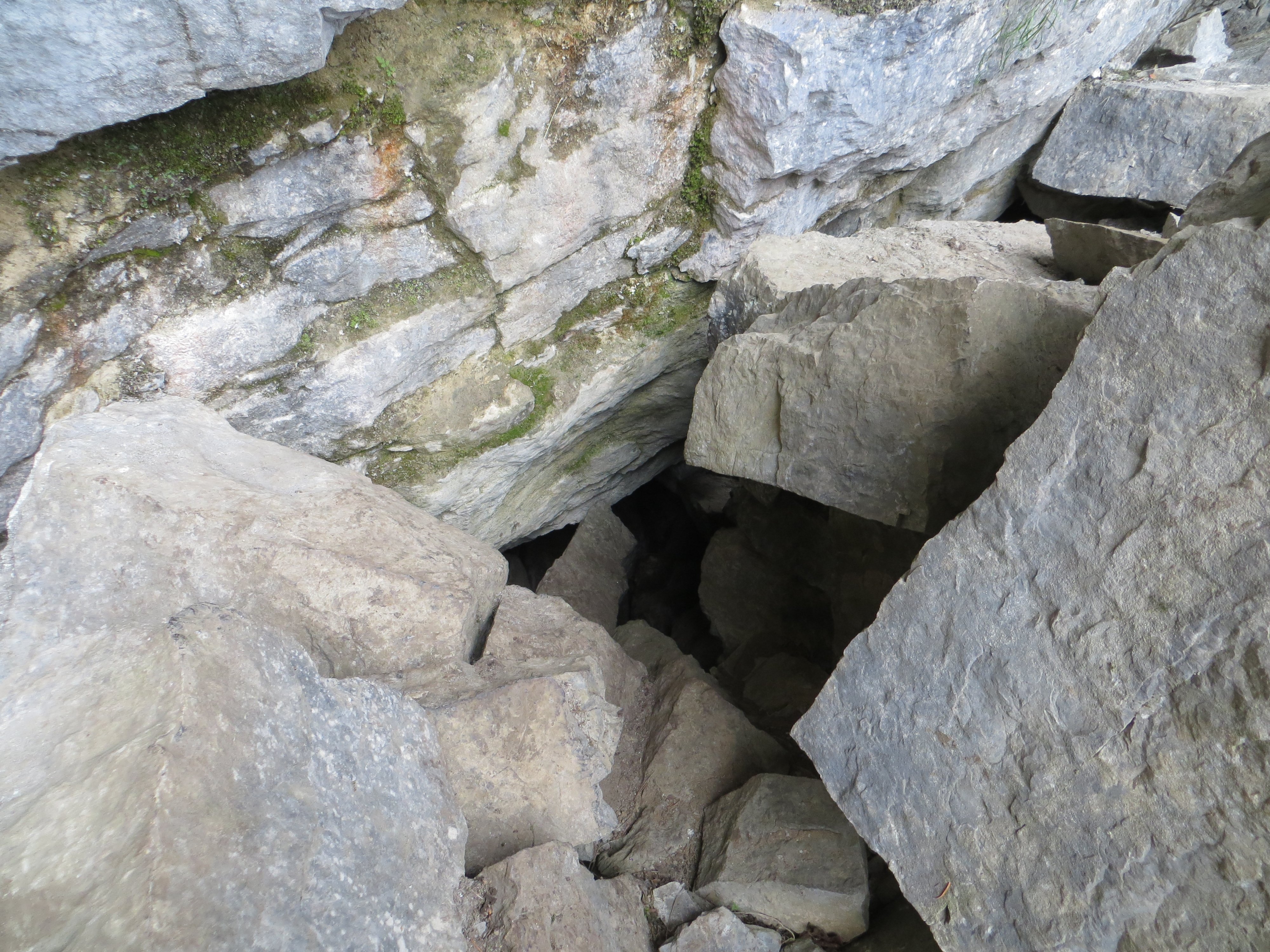 Тропа поднимается по скользкому склону вверх. Я с детенышей остаюсь у реки, а муж поднимается дальше на разведку. Вскоре появляется. "Да, - говорит, - правильно пришли." Я тоже захотела посмотреть, оставила дочу и мужа. Проскользив по тропе вверх, увидела полянку и табличку, а входа не видно. Следы ведут дальше. Прошлась по булыжникам - нет входа. Внимательно присмотревшись, заметила что следы на на булыжниках исчезают у небольшого отверстия между ними.