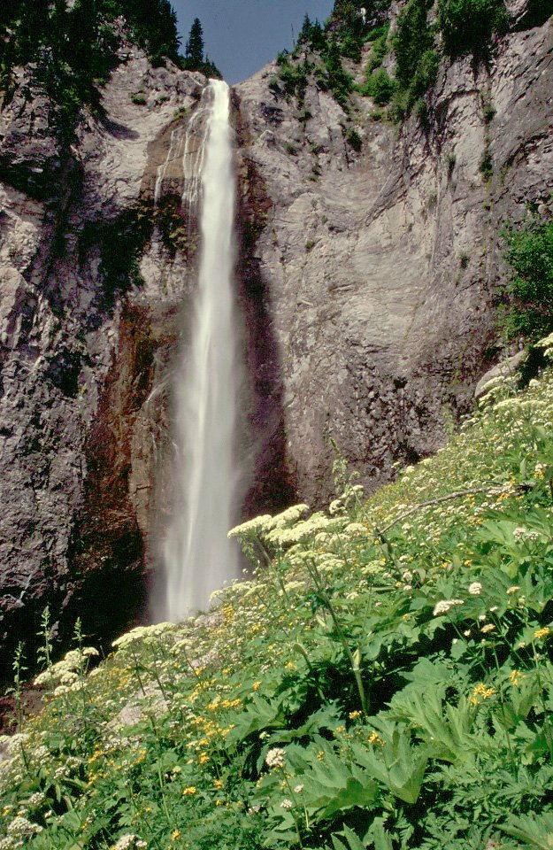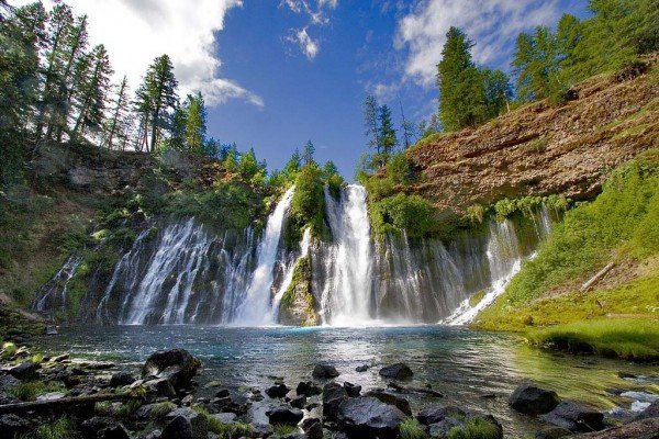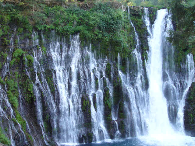 Водопад Бурней на ручье Бурней, в Государственном мемориальном парке Макартур-Бурней, Шаста, штат Калифорния. Вода поступает из подземных источников выше водопада, и падает с высоты 129 футов (58 метров), имея почти постоянный расход в размере 100 млн. американских галлонов в день (4 м ³/с), даже в засушливые летние месяцы. Президент Теодор Рузвельт назвал водопад "восьмым чудом света", и в декабре 1984 года он были объявлен Национальным природным памятником.