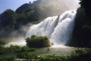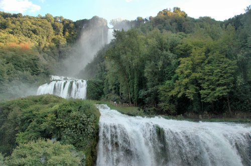 Мраморный водопад (Cascata delle Marmore) является искусственным водопадом, созданным древними римлянами. Его общая высота составляет 165 м (541 футов), что делает его одним из самых высоких водопадов в Европе, и самым высоким искусственным водопадом в мире. Из его 3 секций верхняя является самой высокой - 83 м (272 футов). Он расположен 7,7 км от города Терни, столице провинции итальянского региона Умбрия. Его источником является часть вод реки Velino (остальная река впадает в ГЭС), после протекания через озеро Piediluco вблизи сообщества Мармор. Водопад вливается в долину, образованую рекой Нера. Его поток включается и выключается в соответствии с опубликованным расписанием, чтобы удовлетворить потребности туристов и энергетических компаний. Туристы стараются оказаться там в те моменты, когда шлюзы открыты, чтобы увидеть мощный поток воды.