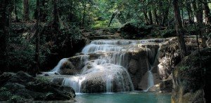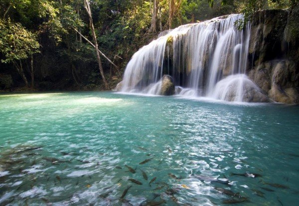 Водопад Эраван, найденный недалеко от Канчанабури, Таиланд, не является одним из самых опасных или оживленных водопадов на земле, но семь каскадов падения, плавно стекающих по склонам, высотой от 10 до 70 футов (от 3.5 до 24 метров) создают успокаивающую атмосферу как никто другой. Месторождения природного известняка делают воду в бассейне под водопадом сверкающих голубых цветов.