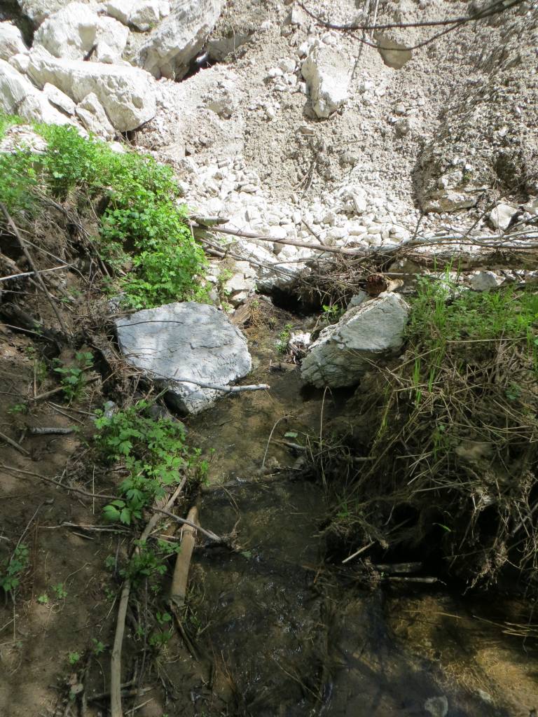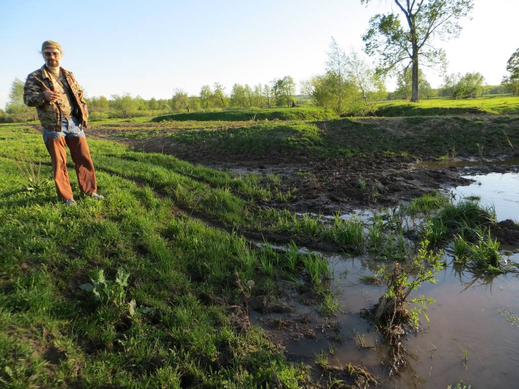 В пятницу вечером быстро собрались и поехали. На удивление из города выехали быстро. Миновали Кальтовку. До Сима оставалось совсем немного, как на пути нас ждал сюрприз - дорогу размыло весенним ручьем. Ничего, в брод его проехать можно. Правда берега глиняные, а колесики глину ох как не любят. Разгон, немного буксуем, и вот мы на другом берегу.