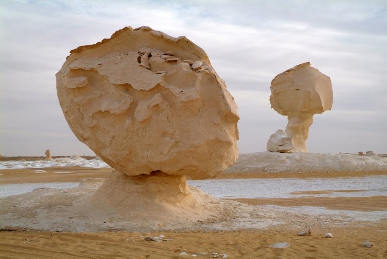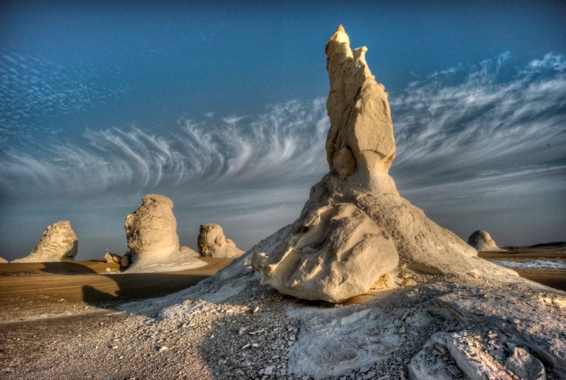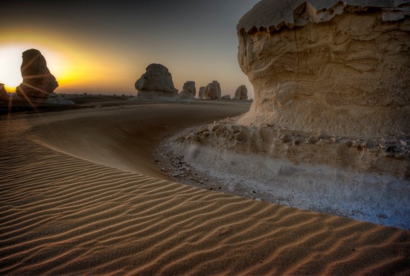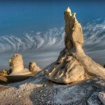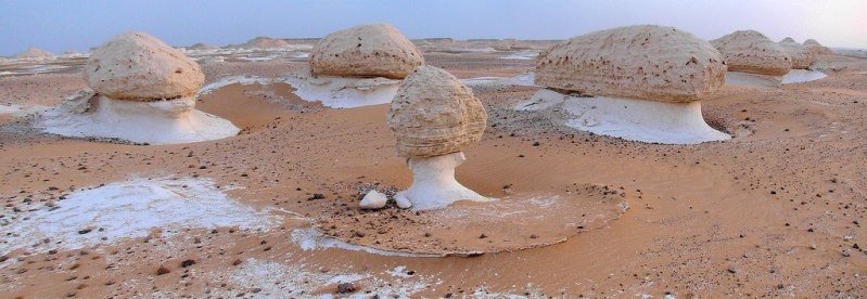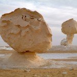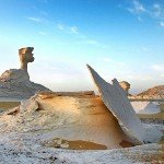 Белая пустыня - это небольшой участок в восточной части пустыни Сахара, площадью примерно в 300 квадратных километров. Находится между египетскими оазисами Бахария и Фарафра. Миллионы лет назад на этом месте было древнее море. Но оно ушло, оставив на дне известняковые отложения, образованные из кальцированных останков морских обитателей - планктона, улиток, аммонитов, кораллов. За тысячи лет ветер и пески превратили морское дно в фантастический пейзаж, который больше напоминает поверхность другой планеты. Необычные фигуры из известняка достигают высоты 10-12 метров. В 2002 году Белая пустыня была объявлена национальным парком.