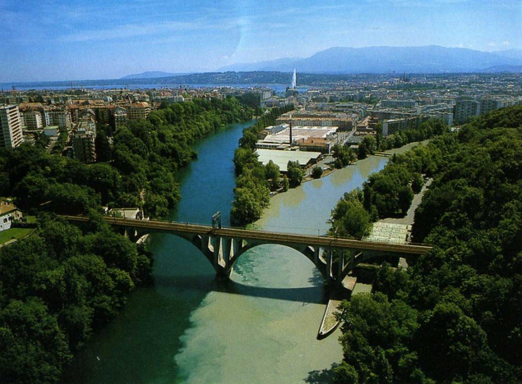 Место слияния рек Рона и Арв (Rhône and Arve)в Женеве, Швейцария. Река слева - Рона, начинается она на Ронском леднике в Лепонтинских Альпах . Справа - река Арв. Исток реки находится в Грайских Альпах, затем она течет на северо-запад, впадая в Рону на западной стороне Женевы, где ее более высокий уровень содержания ила создает такой контраст.