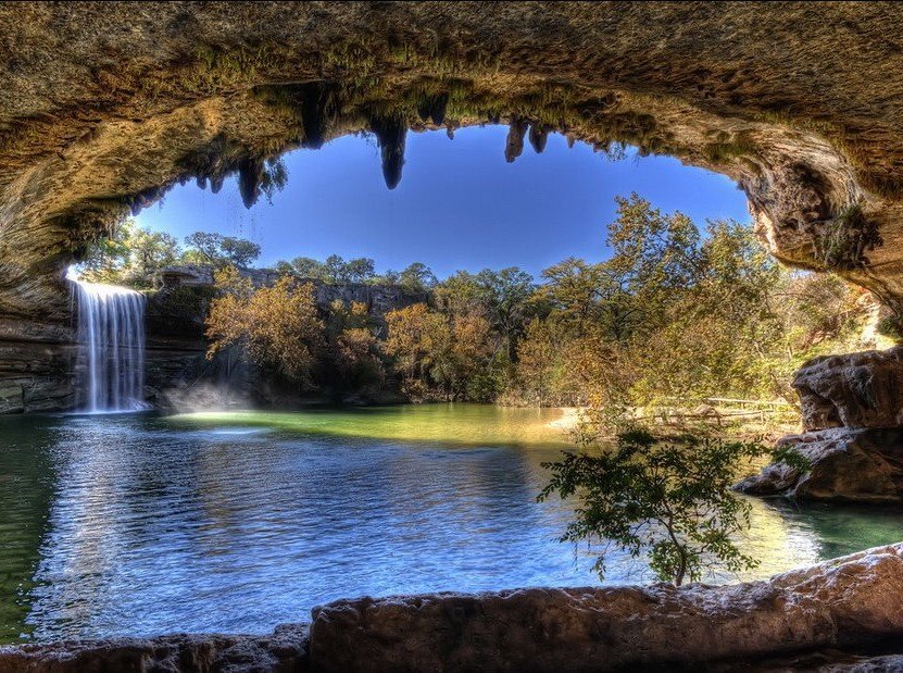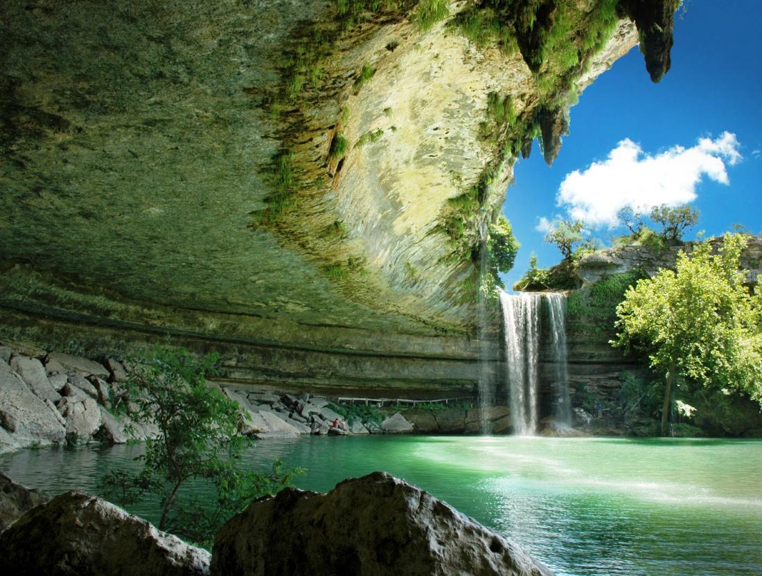 Это одно из красивых и необычных озер Северной Америки находится в штате Техас, недалеко от города Остин. Озеро удивительно тем, что является и подземным, и наземным - часть озера находится под сводами грота. Красоту озеру дополняет водопад, ниспадающий с высоты более 14 метров. Озеро было образовано несколько тысячелетий назад: из-за эррозии известняковых пород свод подземной реки обрушился, образовав провал, который заполнился водами этой реки. Площадь озера небольшая, всего один квадратный километр.Белая Пустыня (Египет)