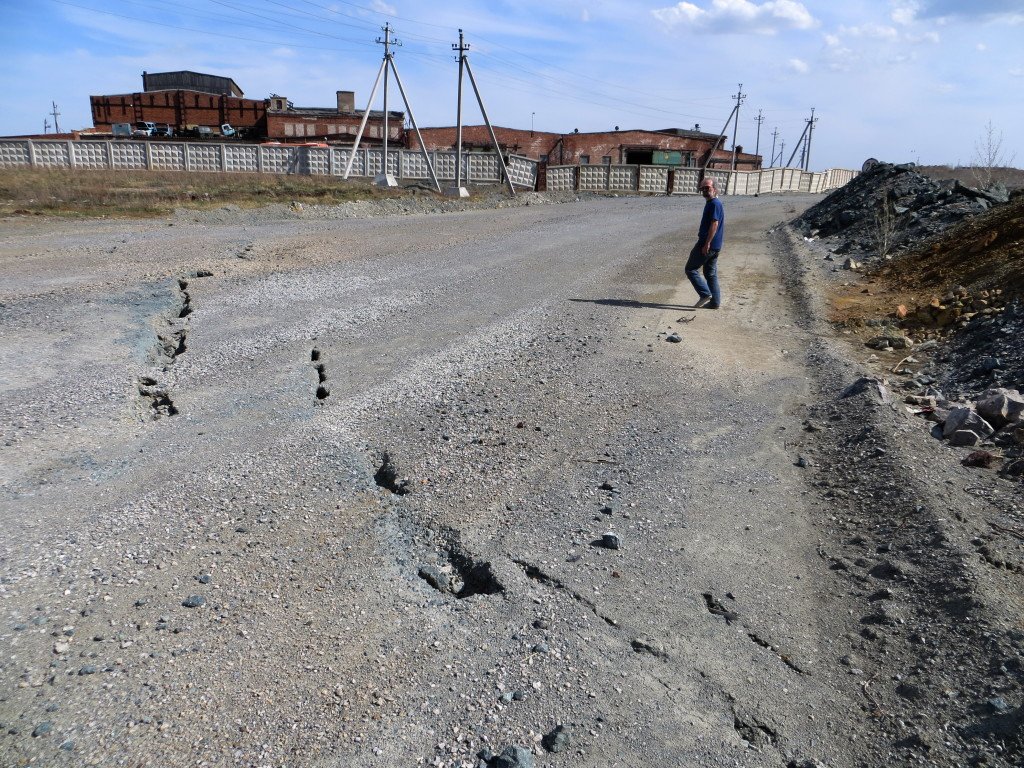 Странно как-то, с одной стороны охраняемая зона, шлагбаум, не пускают. А с другой - свободный вход, ходи кто хочешь, даже в сам карьер можно спуститься. Идем по дороге к карьеру, перешагивая огромные трещины в земле. Нда, запустение, разруха да и только. Давненько здесь уже никто не работает.
