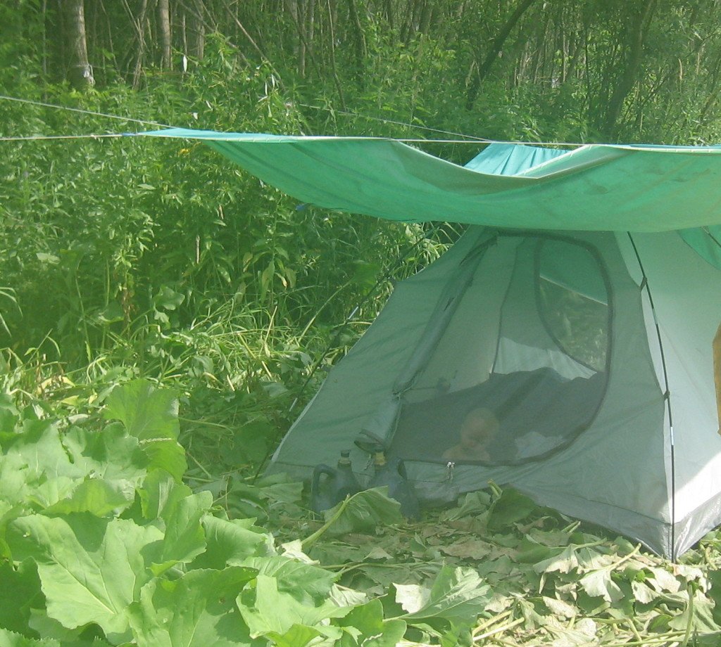В летние жаркие дни, как вариант, над внутренней палаткой можно натянуть навес, который спасет от солнца днем и от росы и небольшого дождика ночью, а в палатке будет свежо и сухо.