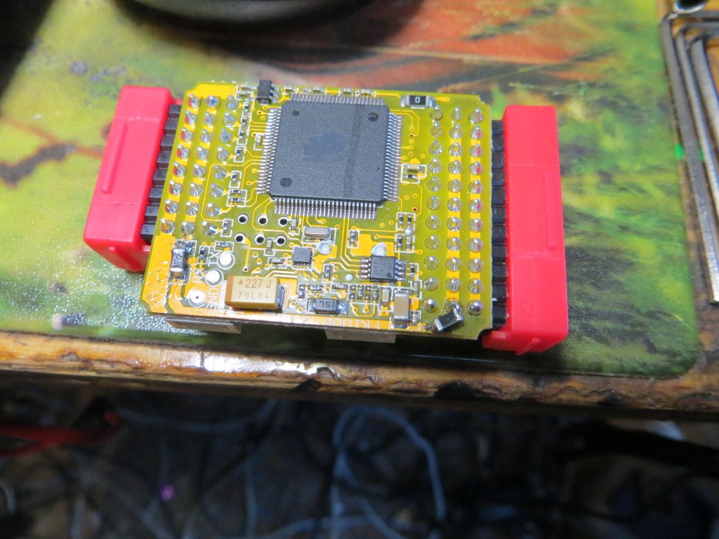 Теперь можно и собирать. Новый модуль заметно меньше, поэтому его можно подать малость вперед и этим освободить место под крышкой. Делаю плату вместо карбонового кругляка, на двухсторонний скотч наклеиваю модуль, соединяю землю - можно пробовать!