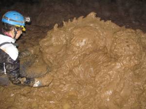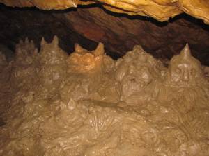 В гроте Глиняных гор, который протянулся на 40 метров, в середине тянется глинянный гребень скрутыми откосами. Тут начинается самое интересное - глиняные тропы наполненные водой и жижей. Ноги проваливаются в вязкую глину порой на 30-40 сантиметров.