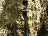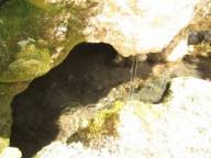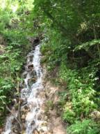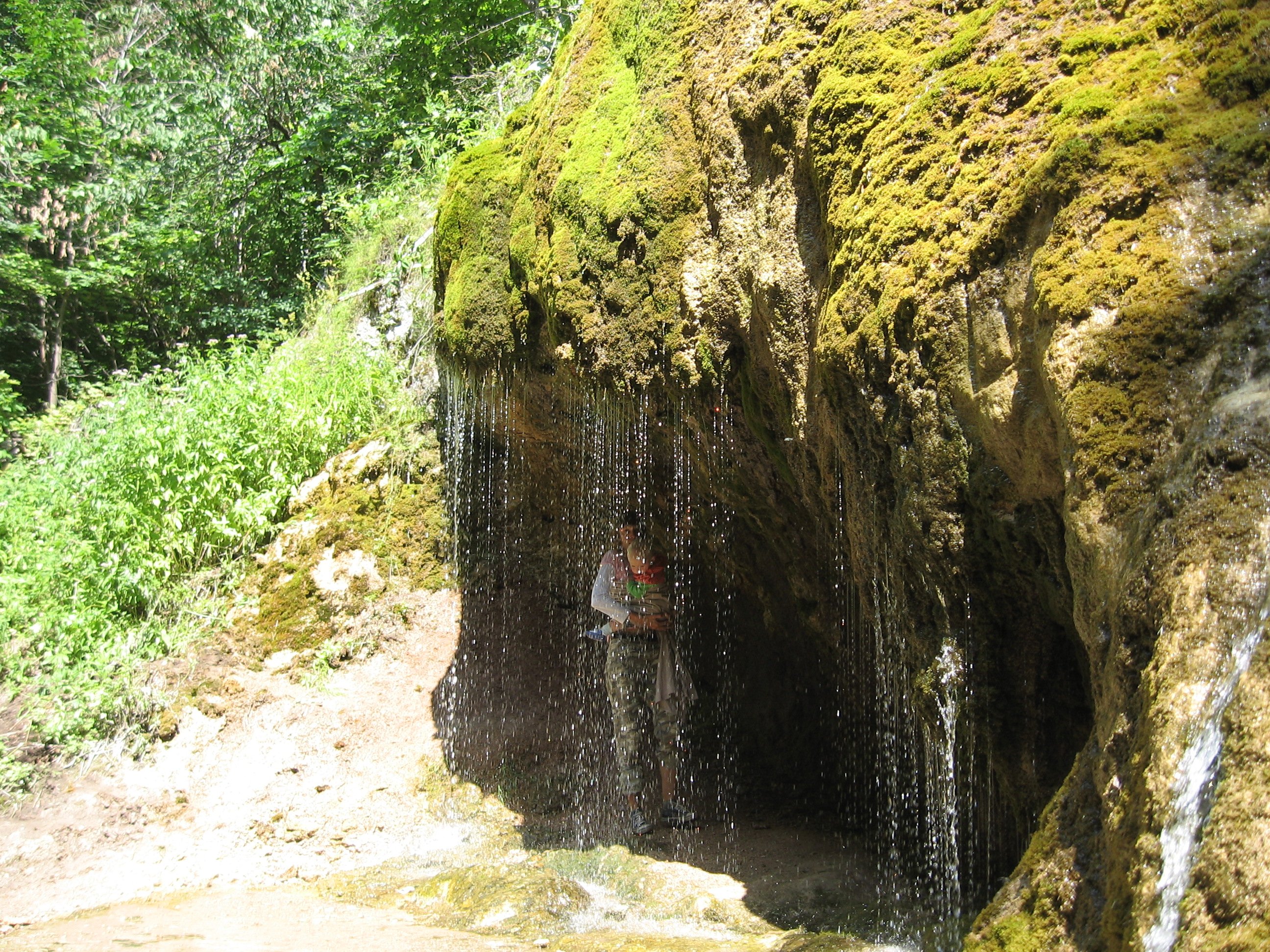 Место возле водопада восхитительное: скала испещрена множеством каналов, ходов, пещерок, скальных выступов и водопадиков, стекающих по камням. Пещерки есть и совсем маленькие, куда не проходит рука, и неглубокие, где можно и поместиться на корточках. Во всех этих пещерках журчит и капает вода, а в некоторых на дне образуется озеро-чаша с прозрачной голубоватым оттенком водой. Зрелище потрясающее!