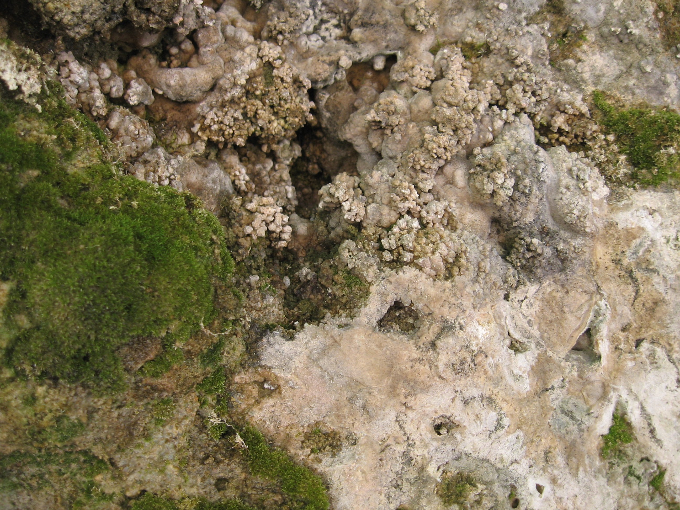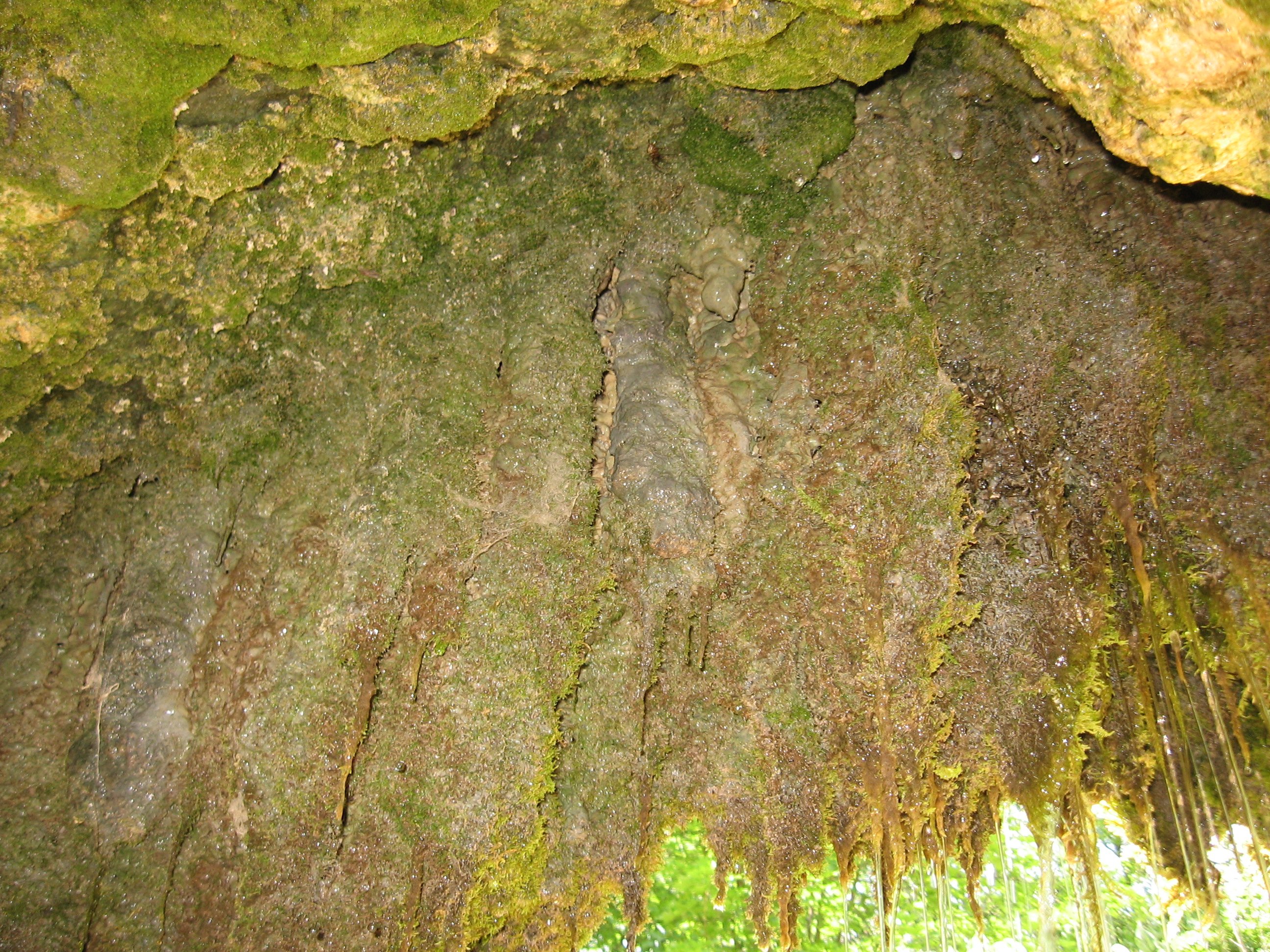 Удивительно то, что стены грота не карстовые, а натечные: состоят из окаменевшего мха и отложений кальцитов, в точности как сталактиты в пещерах. Да и сами сталактиты растут на уступе скалы, с которого падают струйки водопада. Да и вся поверхность скалы рядом с водопадом - это результат многовековых отложений кальцитов на мху, так что все камни неожиданно оказываются пористыми, ажурными и очень непрочными.