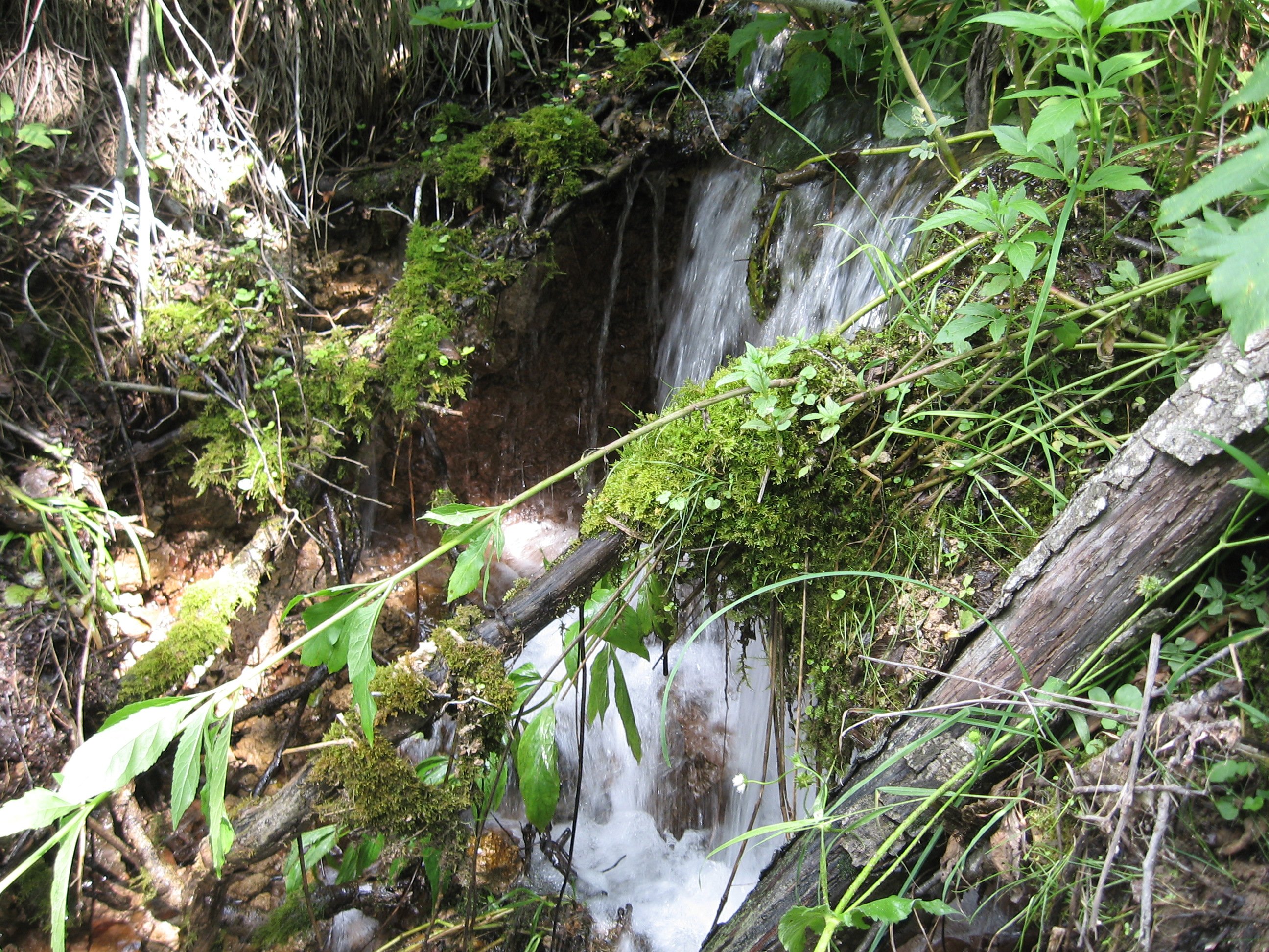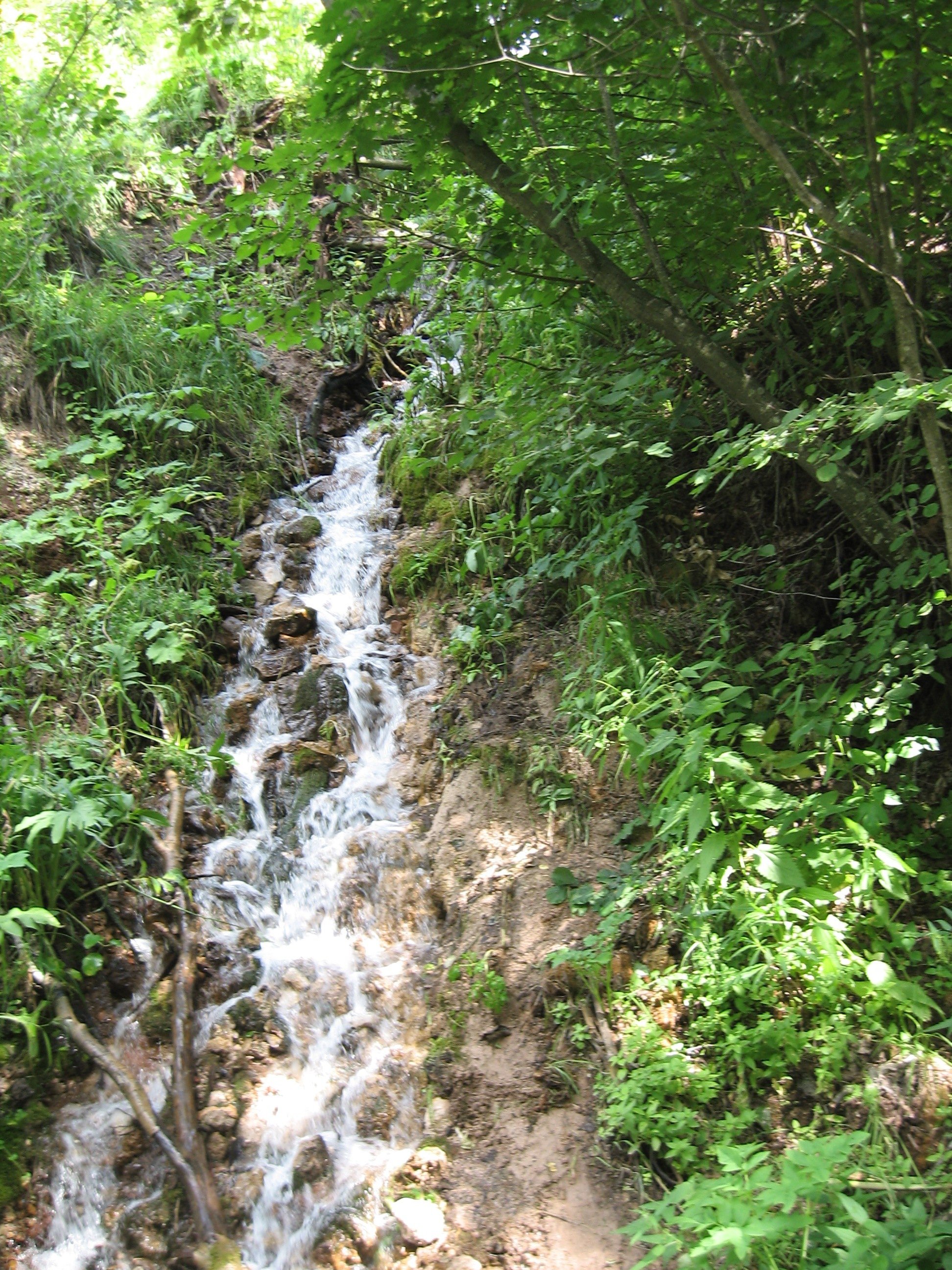 Вода из водопада, равно как из остальных источников, разбиваясь о подошву скалы, сливается в единый ручеек и дальше бежит, журчит по ущелью, образуя внизу еще каскады небольших водопадиков, и примерно через четыре километра впадает в речку Кидаш.