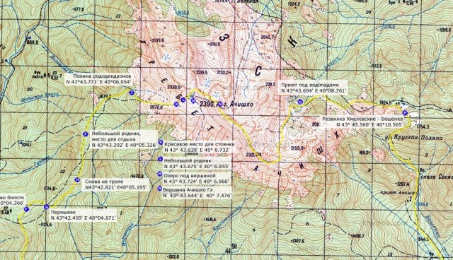К основным вершинам массива относятся: г. Ачишхо Главная (2391,4 м), г. Ачишхо I Восточная (2321,4 м), г. Ачишхо II Восточная (2363,2 м), г. Ачишхо Западная (2317,7 м), г. Лошадиная голова (2159,0 м).