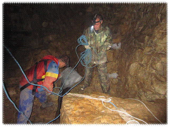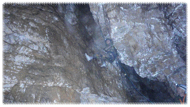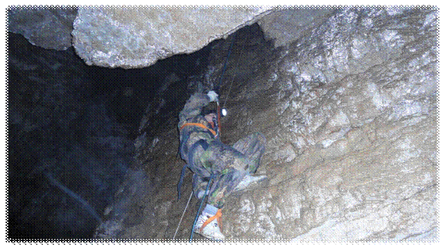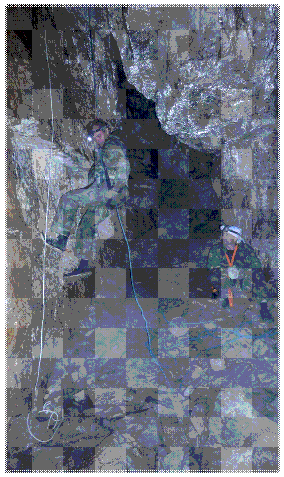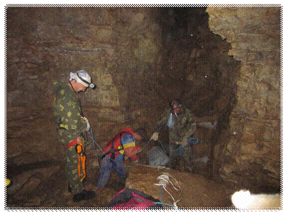 Пока Людмила и Светлана морально настраивались к спуску примерно с 30 метровой высоты, и проверяли своё снаряжение, мы с ребятами навешивали верёвки в колодец в Олимпийской. Галина осталась наверху у входа в пещеру для подстраховки.