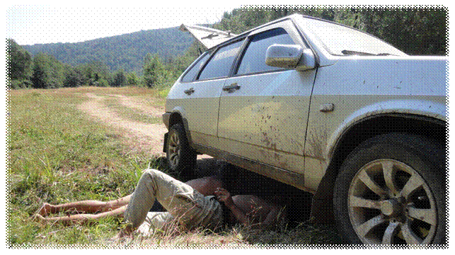 Вернувшись, мы пообедали, собрали вещи и снаряжение. Провели небольшие ремонтные работы, всё-таки, когда мы гнали на девятке за нивой, зацепились днищем об камень и немного повредили глушитель.