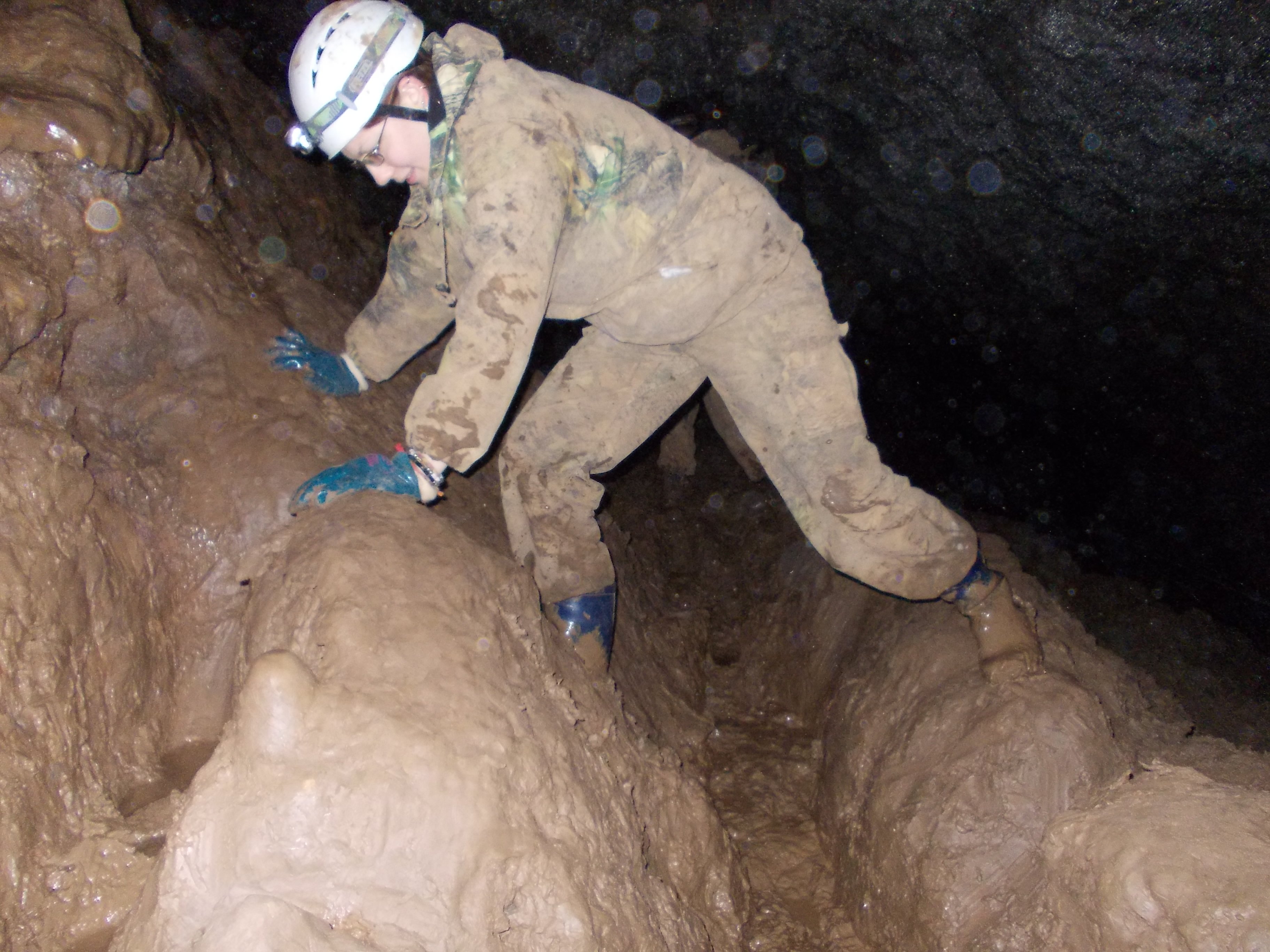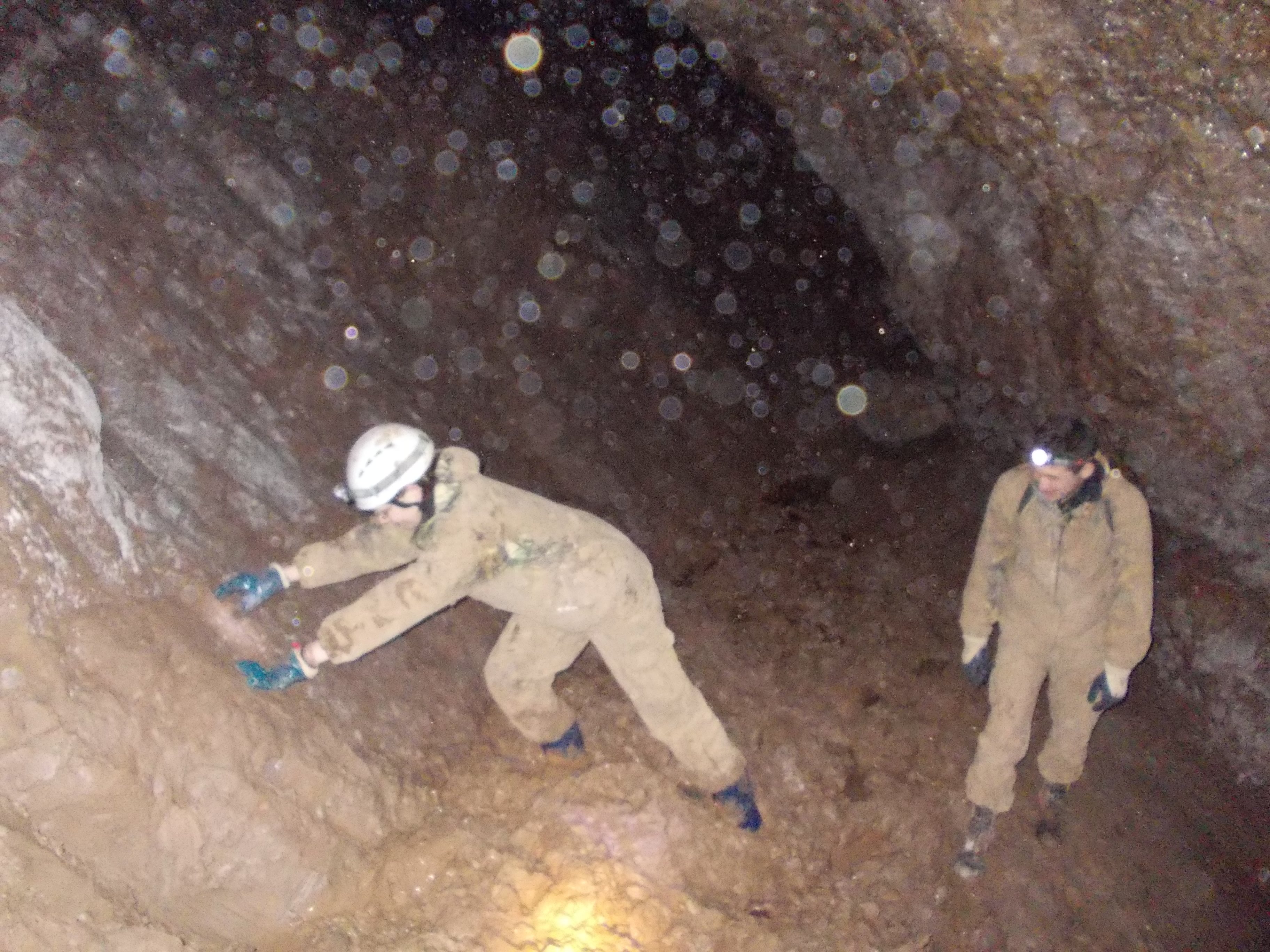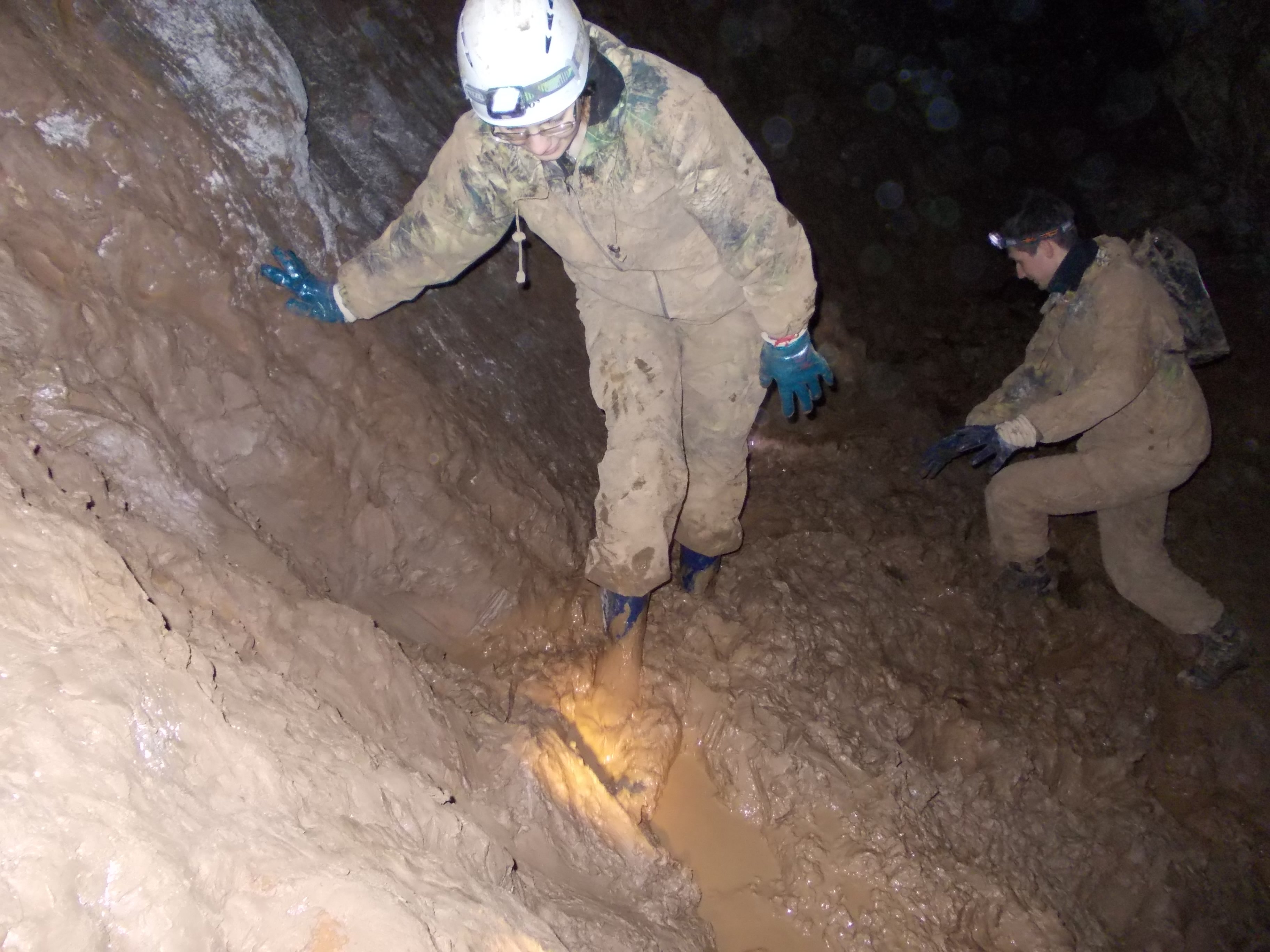 Сделав несколько снимков двинулись дальше, следующий грот неожиданный был чуть меньше но такой же глинистый, здесь кончается шнурка проводник, спустились до конца зала, несколько развилок решено идти влево в низ, здесь попадаются чистые большие камни. пройдя по лазу выходим к сифону сделав пару снимков выходим обратно на исходную и в контурный зал в нём много вылепленных из глины фигурок.