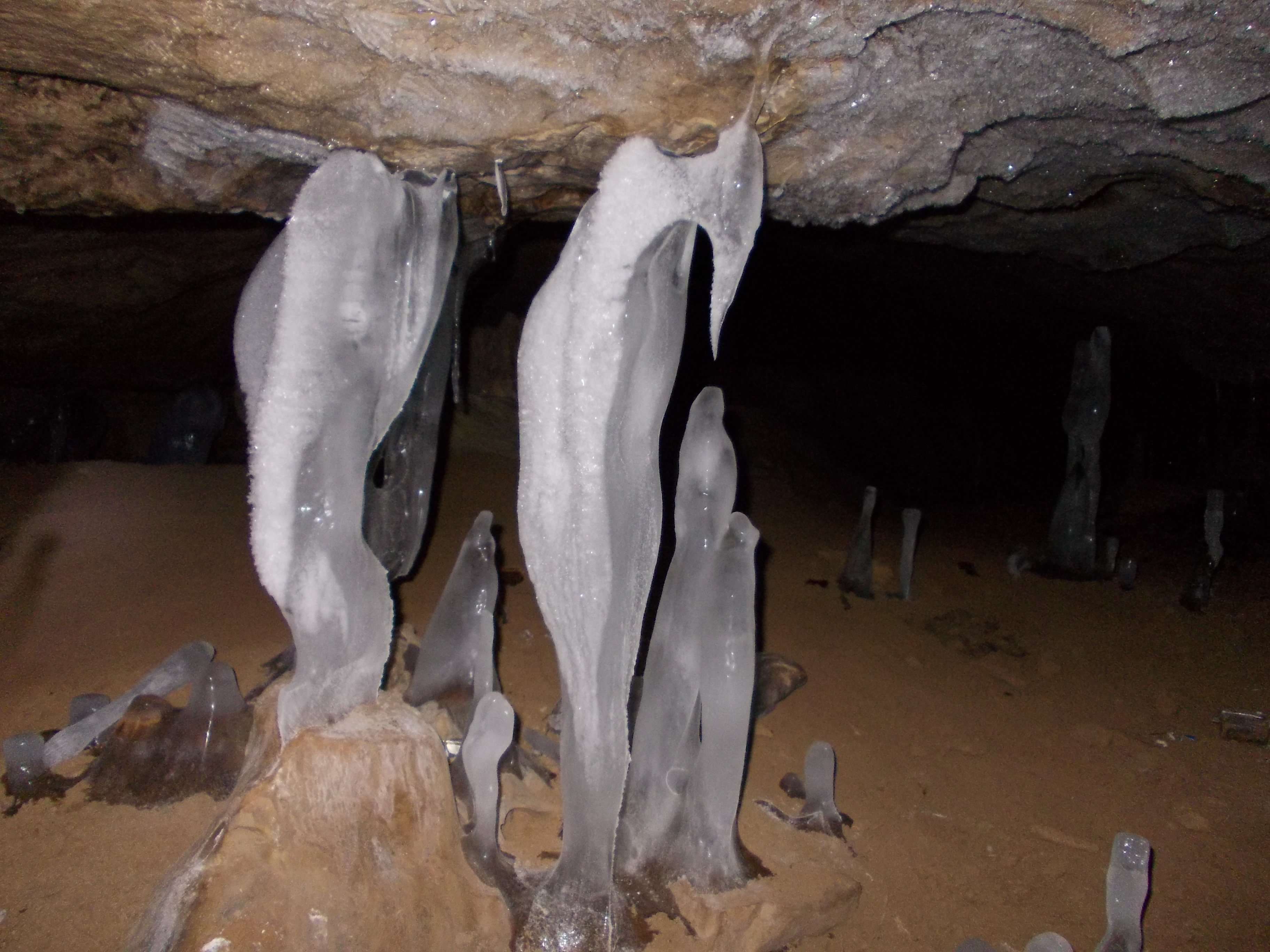 Входим в пещеру, первым идёт грот температурных аномалий, довольно объёмный зал в котором зимой сухо, а летом холодно и весь он покрыт инеем. Проходим его не задерживаясь, в конце потолок с полом резко сужаются переходя в кальцитовый лаз примерно в 50 см высотой и с десяток метров шириной, тут нам приходится попотеть, где на четырёх