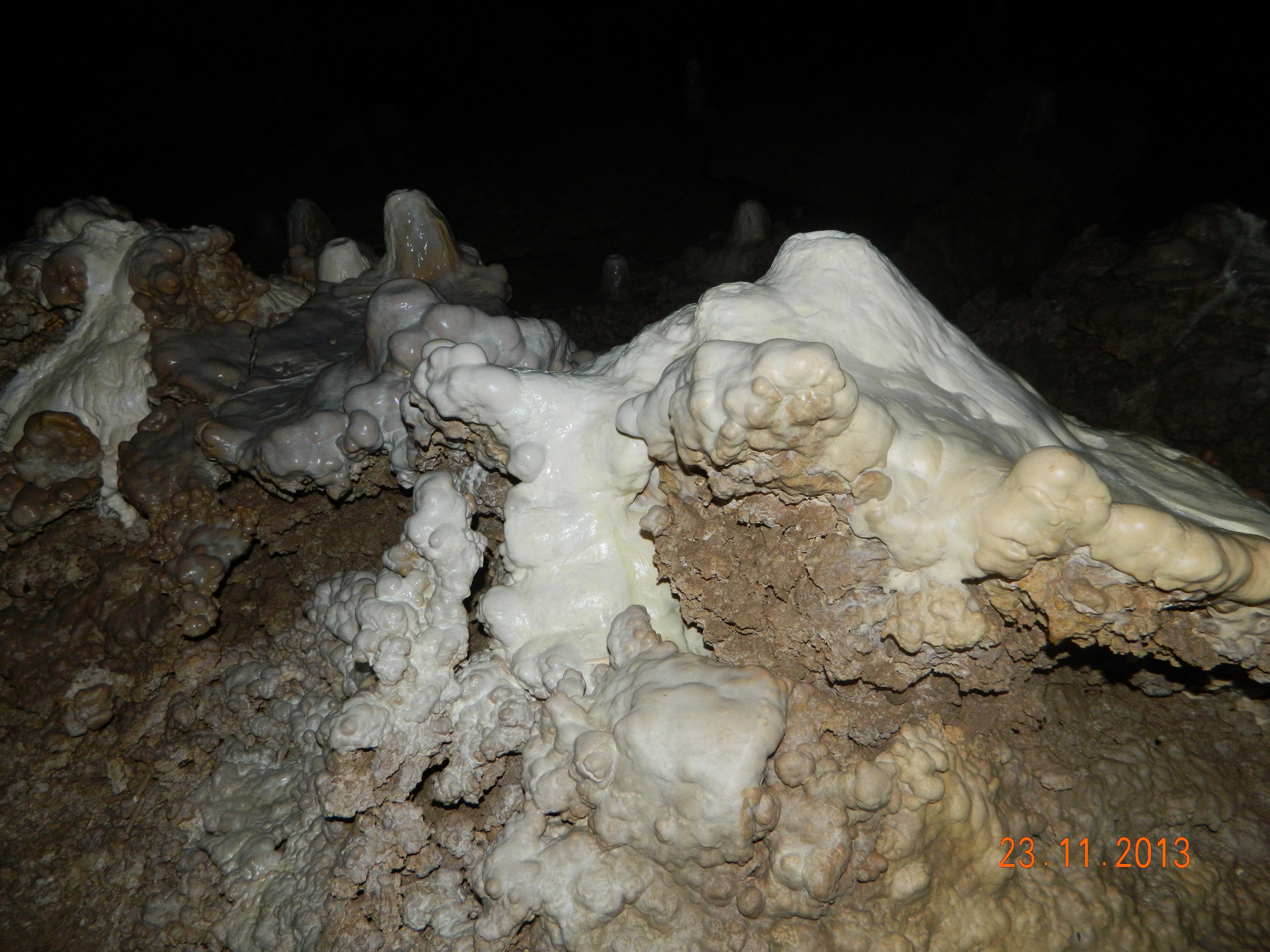Красиво смотрится среди мрака белоснежные образования, натёки и сталагмиты.