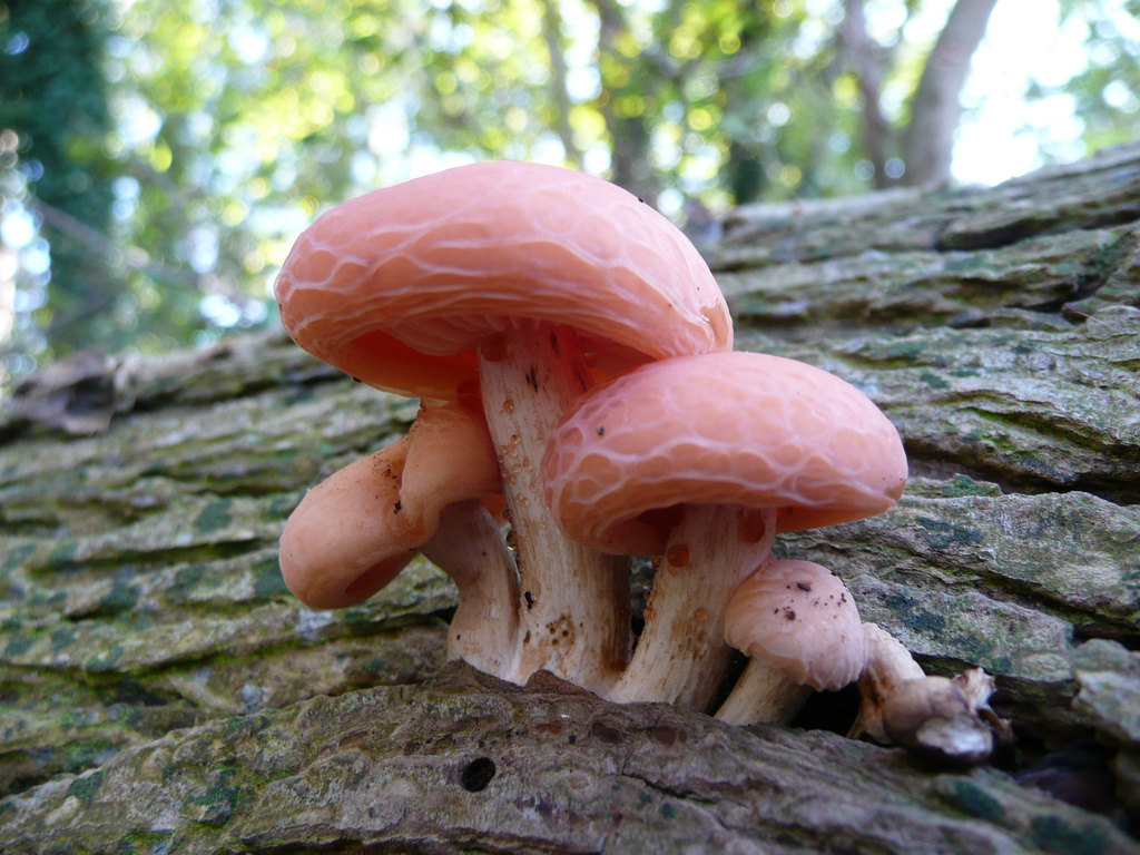 У этого гриба очень специфическая внешность: его розовая или лососево-розовая, оранжево-розовая шляпка в зрелости часто покрыта венозной сеточкой, за что его иногда называют «сморщенным персиком». К тому же и запах имеет фруктовые оттенки. Ножка часто эксцентричная. Мякоть гриба студенистая, эластичная. Растет на мертвой древесине лиственных пород, предпочитая валежные стволы и пни вязов. Встречается редко по всему северному полушарию: на востоке Северной Америки, в северной Африке, Европе и Азии.